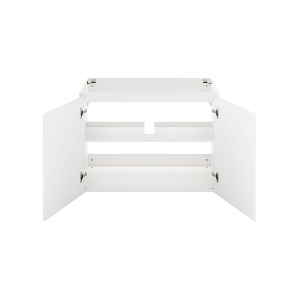 The sleek look and clean-lined silhouette of the Bryn 36" Wall-Mount Bathroom Vanity add modern style to your bathroom space. Durably crafted with particleboard and melamine, this vanity mounts directly to the wall and features ample storage space under the sink behind two soft-close doors. Assembly required. Sink basin and fixtures not included. Set Includes: One - Bryn 36" Wall-Mount Bathroom Vanity