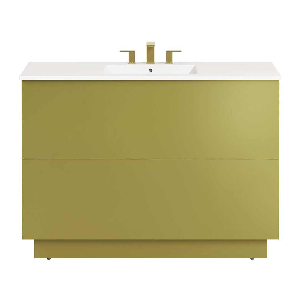 Experience a harmonious blend of luxury and practicality with the Quantum 48" Bathroom Vanity. This modern bathroom vanity features a sleek ceramic single sink basin with 8" centerset holes and integrated countertop, awaiting your personalized fixture choices (not included). Durably crafted from MDF and showcasing a refined gold finish, this vanity cabinet radiates sophistication. A spacious full-glide drawer offers ample storage for bathroom essentials, complementing the sleek design. Assembly is required, promising a rewarding setup for this functional, modern vanity. Set Includes: One - Cayman 48" Bathroom Sink One - Quantum 48" Bathroom Vanity Cabinet