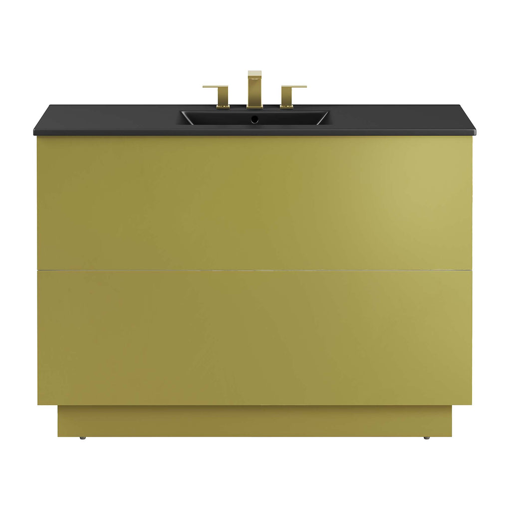 Experience a harmonious blend of luxury and practicality with the Quantum 48" Bathroom Vanity. This modern bathroom vanity features a sleek ceramic single sink basin with 8" centerset holes and integrated countertop, awaiting your personalized fixture choices (not included). Durably crafted from MDF and showcasing a refined gold finish, this vanity cabinet radiates sophistication. A spacious full-glide drawer offers ample storage for bathroom essentials, complementing the sleek design. Assembly is required, promising a rewarding setup for this functional, modern vanity. Set Includes: One - Cayman 48" Single Basin Bathroom Sink One - Quantum 48" Bathroom Vanity Cabinet