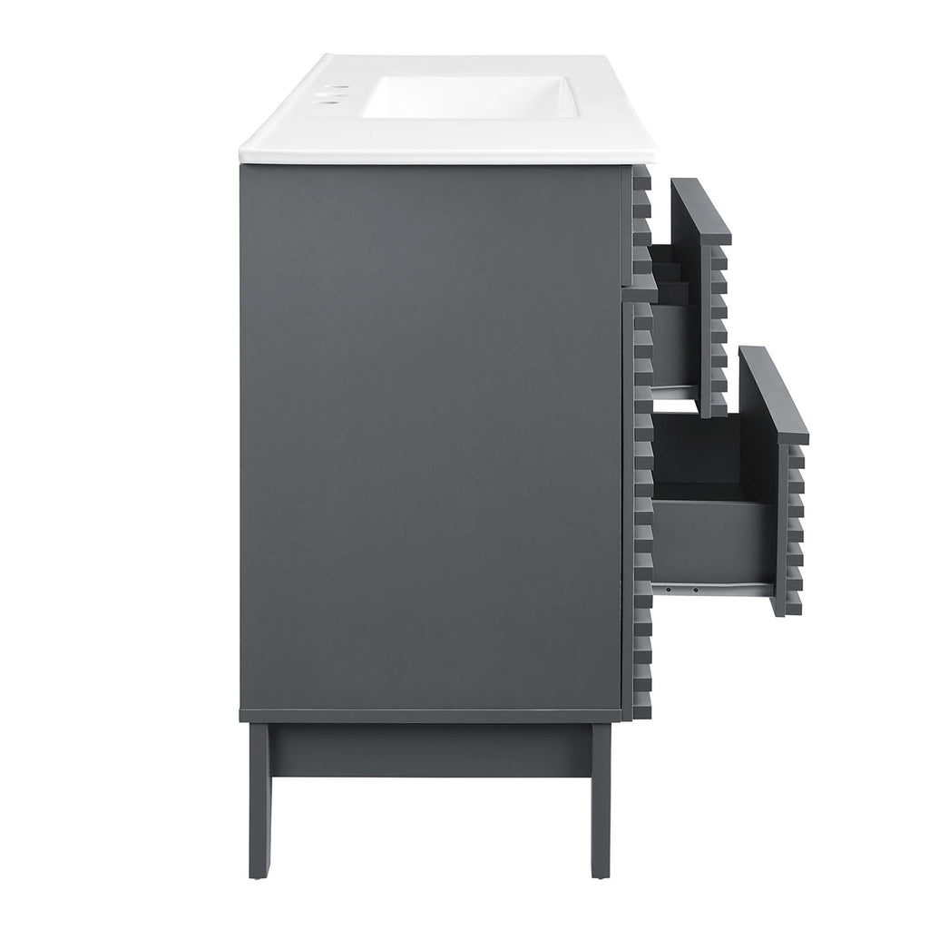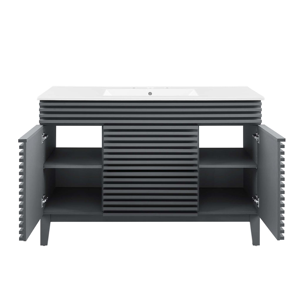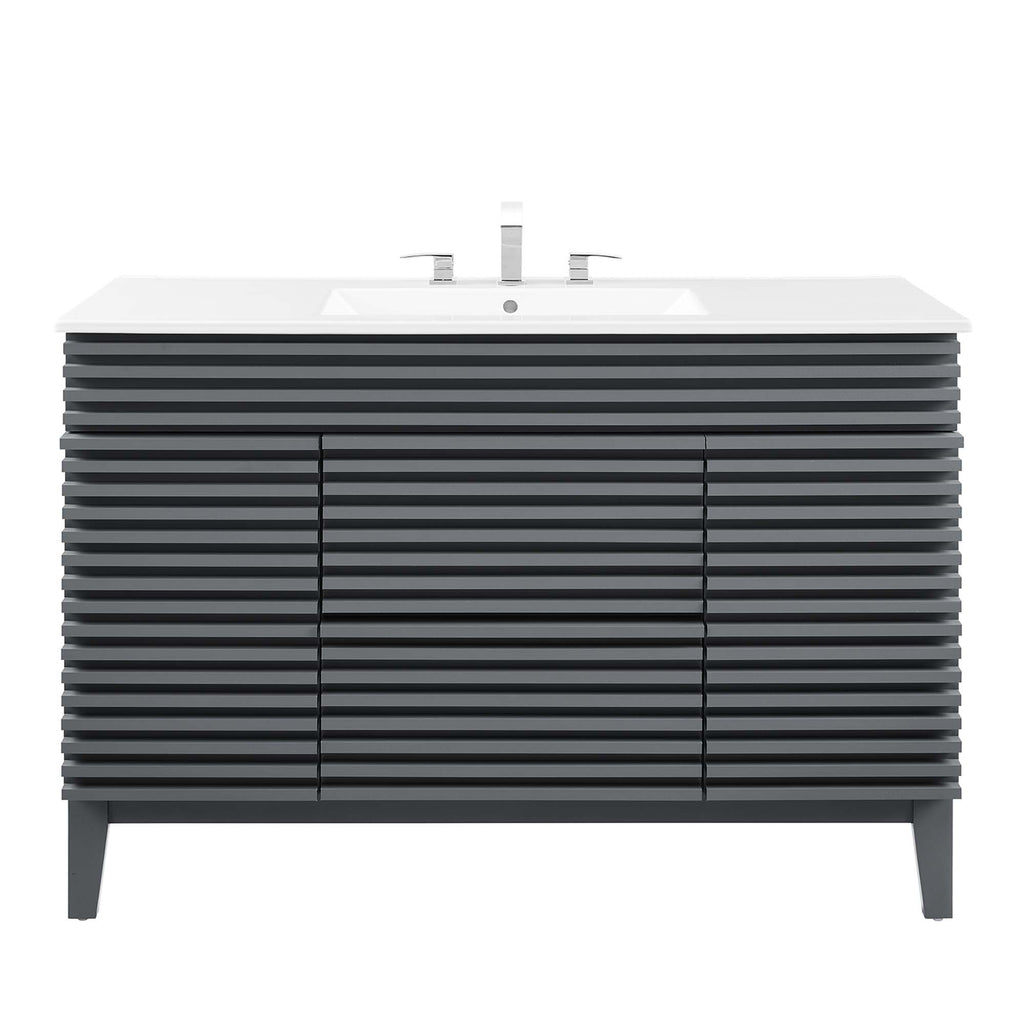 Tap into mid-century aesthetics with the Render Vanity. The Render 48" Bathroom Vanity features a durable MDF and particleboard frame with smooth walnut grain laminate, four tapered wood legs, and ample under sink storage space in full-extension drawers and behind soft-close hinged doors. Crafted with ceramic, a single sink with an integrated countertop, 8" widespread, and rectangular sink basin continue the sleek look of this retro modern vanity. Clean lines and crisp design align for an edgy style designed to meet your needs. Boasting a mid-century modern style this vanity features a solid construction with a pleasing look and practical functionality. Assembly required and fixtures not included. Set Includes: One - Render 48" Single Sink Bathroom Vanity