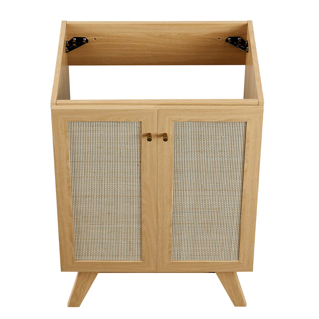 Introduce refreshing style to your restroom with the Soma 24� Bathroom Vanity Cabinet. Showcasing a beautiful rattan weave on the cupboard doors, this vanity cabinet brings organic aesthetics and modern functionality to any bathroom or powder room. Crafted from durable MDF and particleboard with a natural wood grain finish, this cabinet features an adjustable shelf, providing easy customization for arranging towels, toiletries, and bathroom necessities. Complete with metal doorknobs with a brushed gold finish and soft-close hinges, this bathroom vanity cabinet is designed for quiet and effortless functionality. Resting on splayed legs, the Soma Bathroom Vanity includes non-marking foot caps to protect flooring. Assembly required. Fixtures and sink basin not included. Weight Capacity: 200 lbs. Set Includes: One - Soma 24� Bathroom Vanity Cabinet (Sink Basin Not Included)