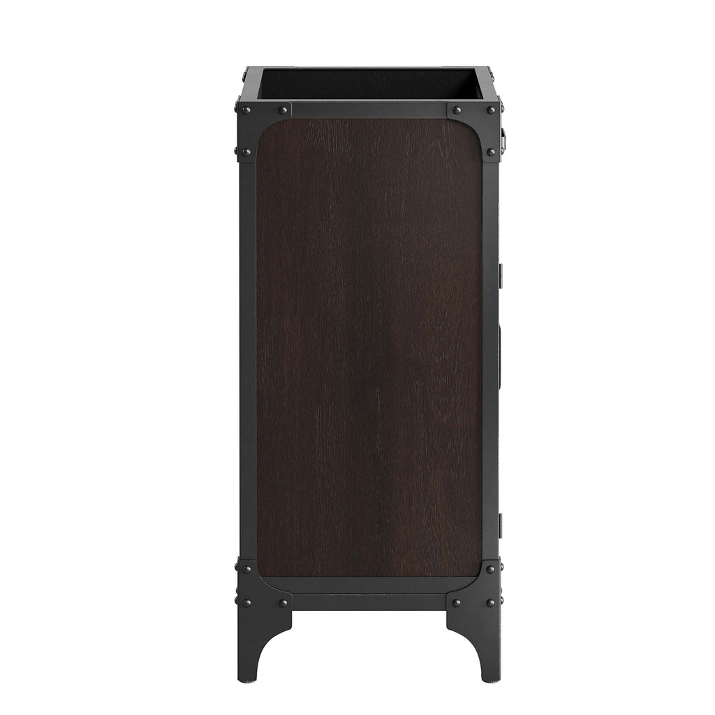 Experience the perfect blend of functionality and industrial modern style with the Steamforge 18" Bathroom Vanity Cabinet. Crafted from sturdy metal with an antique patina and MDF with a beautiful wood grain veneer, this bathroom vanity cabinet brings a touch of utilitarian elegance to your bathroom decor. With a fixed drawer, pivot hinges, and spacious shelving complete with a plumbing cutout, this vanity provides ample storage space for all your bathroom essentials. With non-marking foot pads to protect your flooring, this bathroom vanity offers the ideal balanace of design and practicality. Sink basin and fixtures not included. Set Includes: One - Steamforge 18" Bathroom Vanity Cabinet