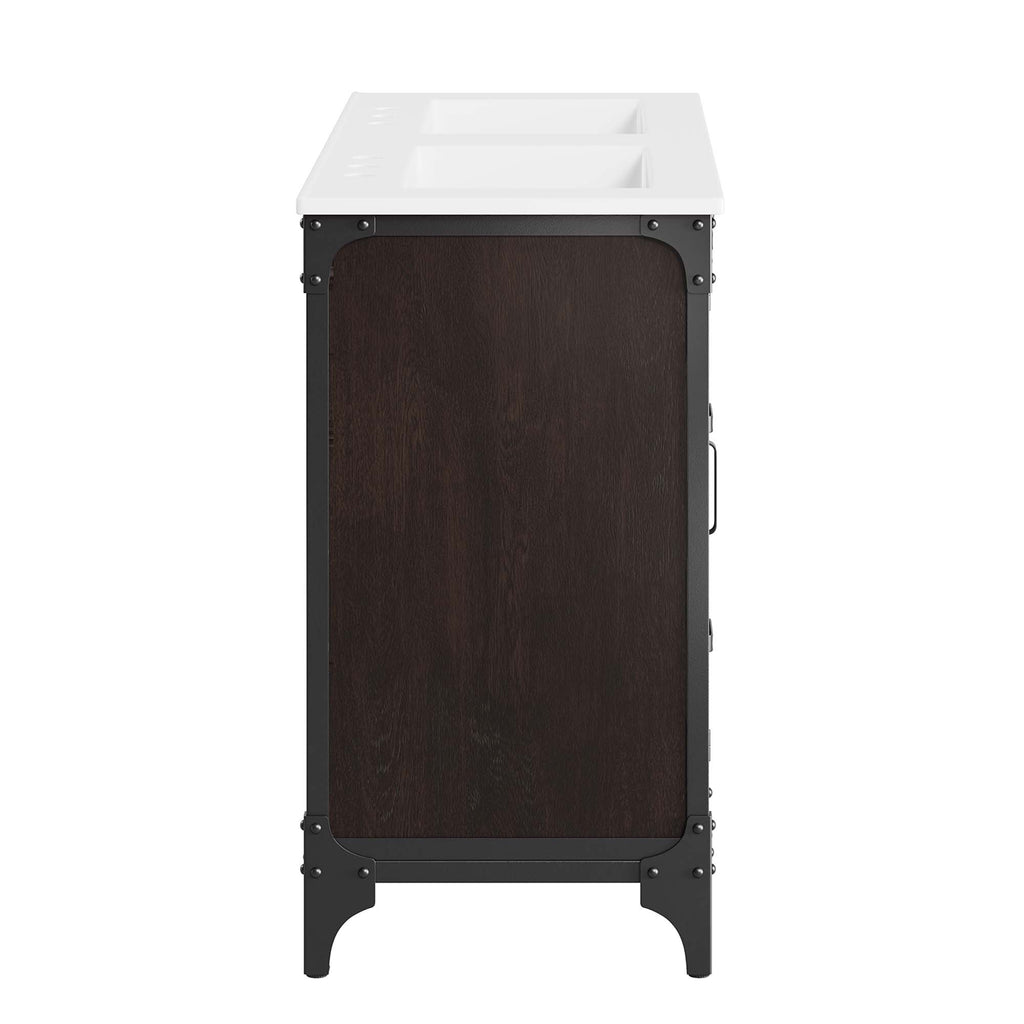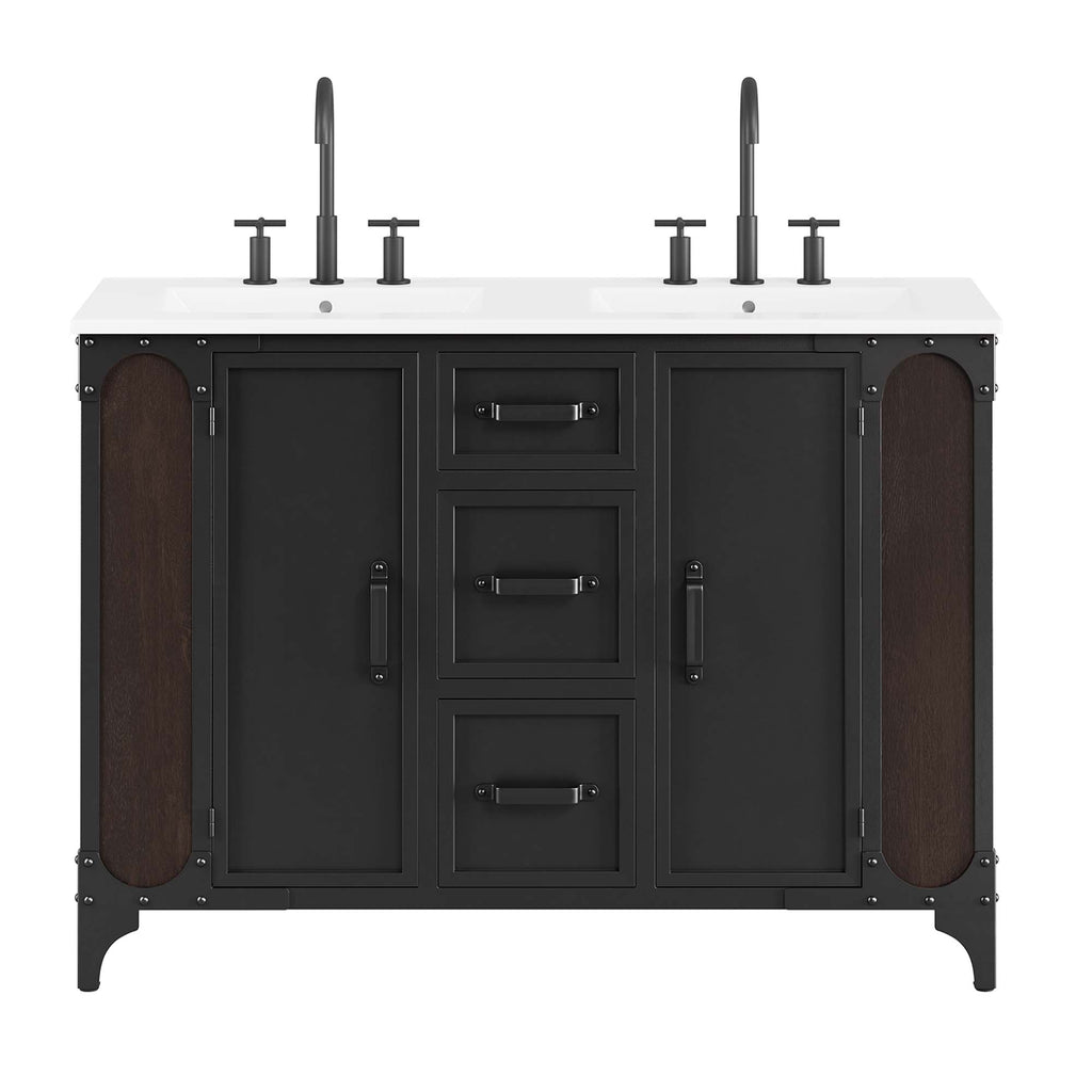 Experience the perfect blend of functionality and industrial modern style with the Steamforge 48" Dual Sink Bathroom Vanity. Crafted from sturdy metal with an antique patina and MDF with a beautiful wood grain veneer, this bathroom vanity cabinet brings a touch of utilitarian elegance to your bathroom decor. With a fixed drawer, two full-glide drawers, pivot hinges, and spacious shelving complete with plumbing cutouts, this vanity provides ample storage space for all your bathroom essentials. The ceramic double sink basin boasts an integrated countertop with 8" centerset holes, ready for your chosen fixtures (not included). With non-marking foot pads to protect your flooring, this bathroom vanity offers the ideal balance of design and practicality. Set Includes: One - Cayman 48" Double Basin Bathroom Sink One - Steamforge 48" Bathroom Vanity Cabinet