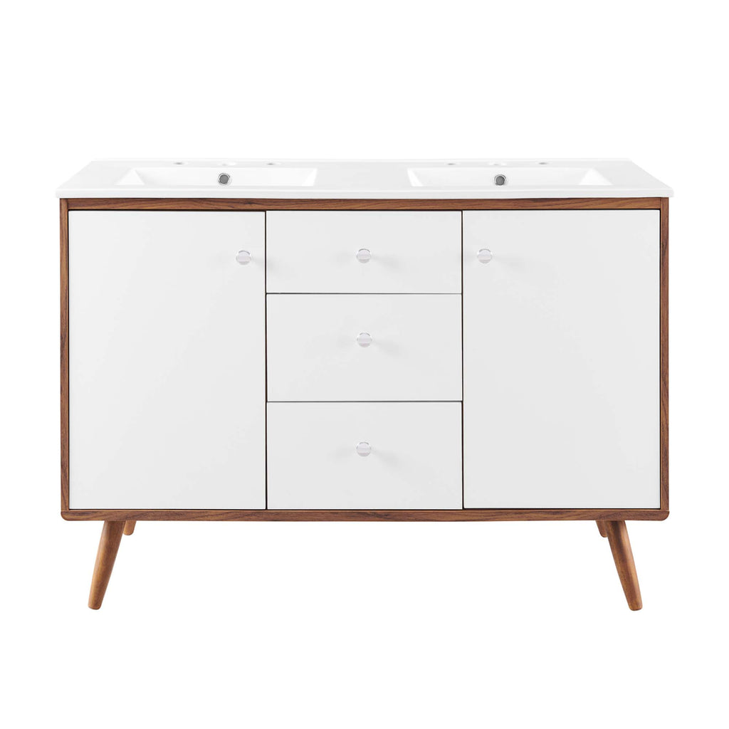 Bring mid-century modern aesthetics into the bathroom with the Transmit 48" Dual Sink Bathroom Vanity. This vanity features a durable particleboard and walnut grain veneer construction with ample storage space for all your bathroom essentials behind two white lacquered soft-close hinged doors and two full-extension drawers with a fixed center drawer. Crafted with ceramic, a double sink with an integrated countertop, 8" centerset, and rectangular sink basin continue the sleek look of this retro modern vanity. Complete with chrome knobs, this bathroom vanity rests atop four splayed wood legs. This double sink has 8� between basins and 24� between basin sink holes. Assembly required and sink fixtures not included. Set Includes: One - Transmit 48" Double Sink Bathroom Vanity