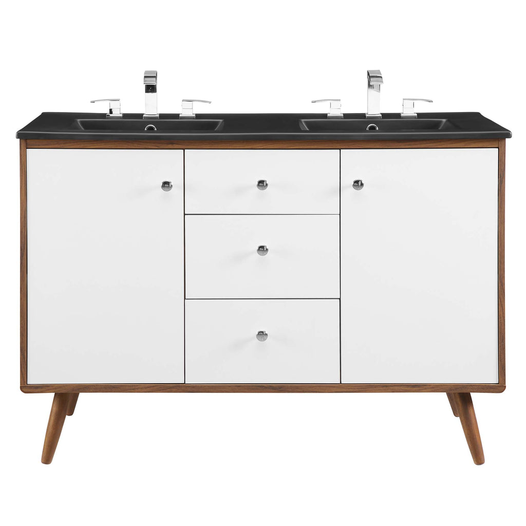 Bring mid-century modern aesthetics into the bathroom with the Transmit 48" Dual Sink Bathroom Vanity. This vanity features a durable particleboard and walnut grain veneer construction with ample storage space for all your bathroom essentials behind two white lacquered soft-close hinged doors and two full-extension drawers with a fixed center drawer. Crafted with ceramic, a double sink with an integrated countertop, 8" centerset faucet holes, and rectangular sink basin continues the sleek look of this retro modern vanity. Complete with chrome knobs, this bathroom vanity rests atop four splayed wood legs. This double sink has 8� between basins and 24� between basin sink holes. Assembly required and sink fixtures not included. Set Includes: One - 48" Double Ceramic Basin top One - 48" double vanity cabinet