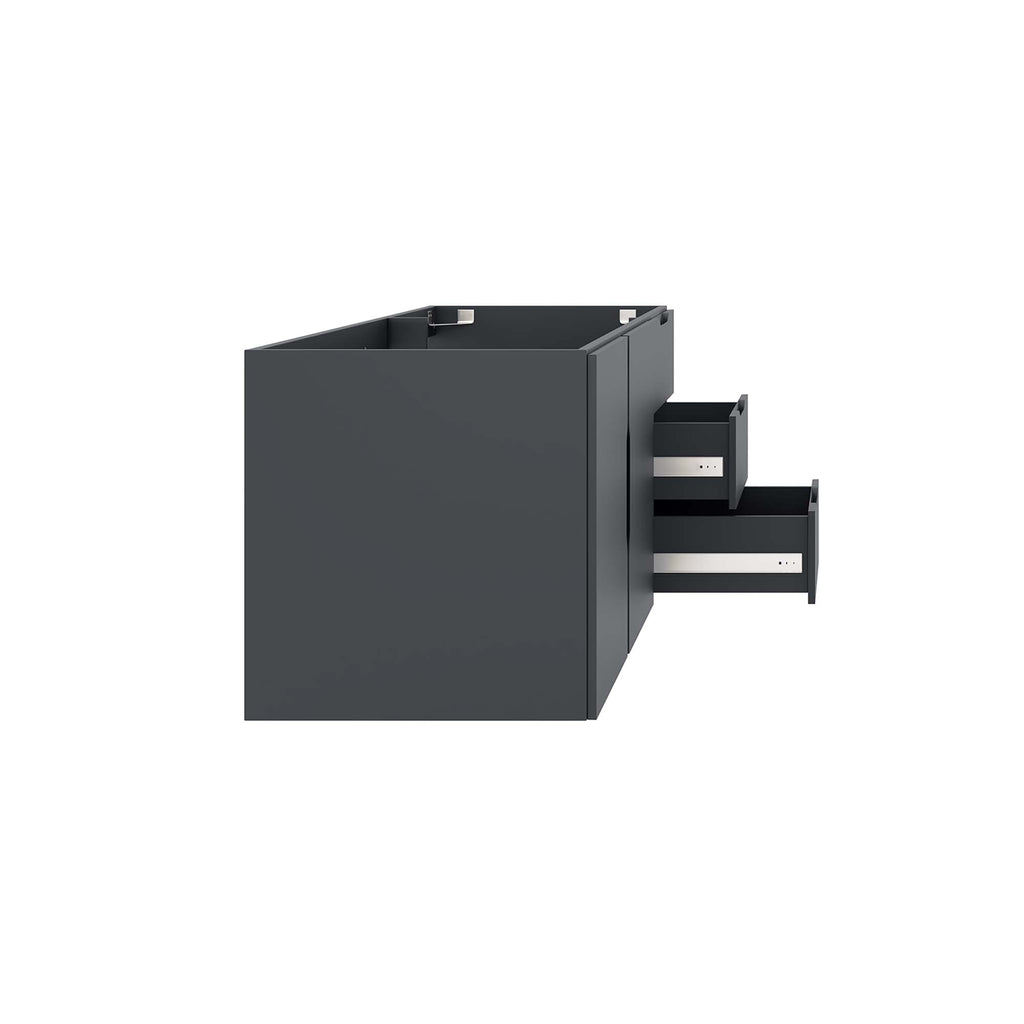 Energize your bathroom space with the modern design of the Vitality 48" Wall-Mount Bathroom Vanity. Boasting a sleek, clean-lined silhouette, this vanity is durably crafted with particleboard and MDF with a melamine finish. This vanity features a wall-mount design and is complete with ample storage space for all your bathroom essentials with two spacious drawers and an under-sink storage area behind two soft-close doors. This vanity boasts an open back design to accommodate plumbing. Sink basin and fixtures not included. Assembly required. Set Includes: One - Vitality 48" Bathroom Vanity Cabinet (Sink Basin Not Included)