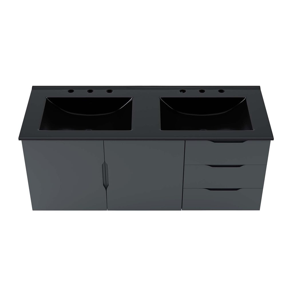 Energize your bathroom space with the modern design of the Vitality 48" Wall-Mount Bathroom Vanity. Boasting a sleek, clean-lined silhouette, this vanity is durably crafted with particleboard and MDF with a melamine finish. This vanity features a wall-mount design and is complete with ample storage space for all your bathroom essentials with two spacious drawers and an under-sink storage area behind two soft-close doors. This vanity is complete with a double sink ceramic basin with 8-inch centerset holes and an integrated countertop. This vanity boasts an open back to accommodate plumbing. This double sink has 8� between basins and 24� between basin sink holes. Fixtures not included. Assembly required. Set Includes: One - Vitality 48" Double Sink Bathroom Vanity