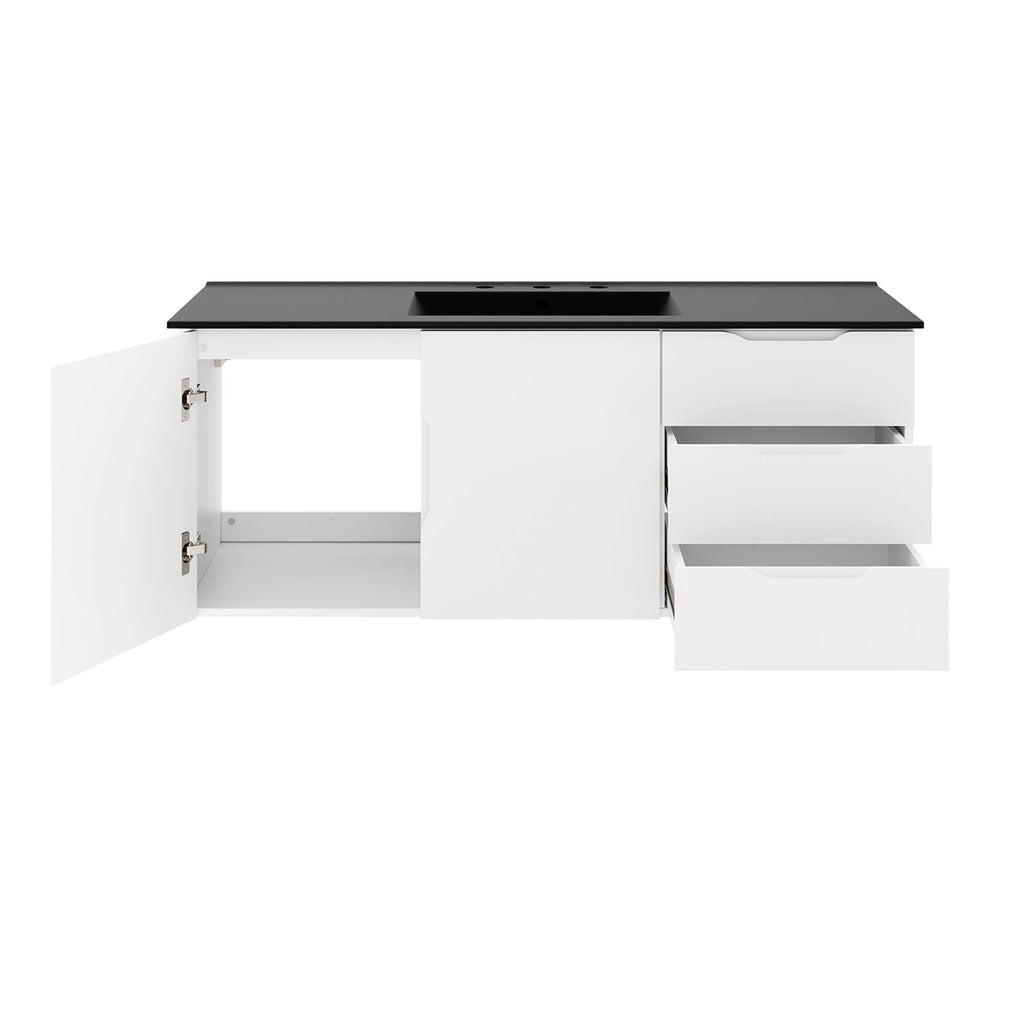 Energize your bathroom space with the modern design of the Vitality 48" Wall-Mount Bathroom Vanity. Boasting a sleek, clean-lined silhouette, this vanity is durably crafted with particleboard and MDF with a melamine finish. This vanity features a wall-mount design and is complete with ample storage space for all your bathroom essentials with two spacious drawers and an under-sink storage area behind two soft-close doors. This vanity is complete with a ceramic sink basin with 8-inch centerset holes and an integrated countertop. This vanity boasts an open back to accommodate plumbing. Fixtures not included. Assembly required. Set Includes: One - Vitality 48" Single Sink Bathroom Vanity