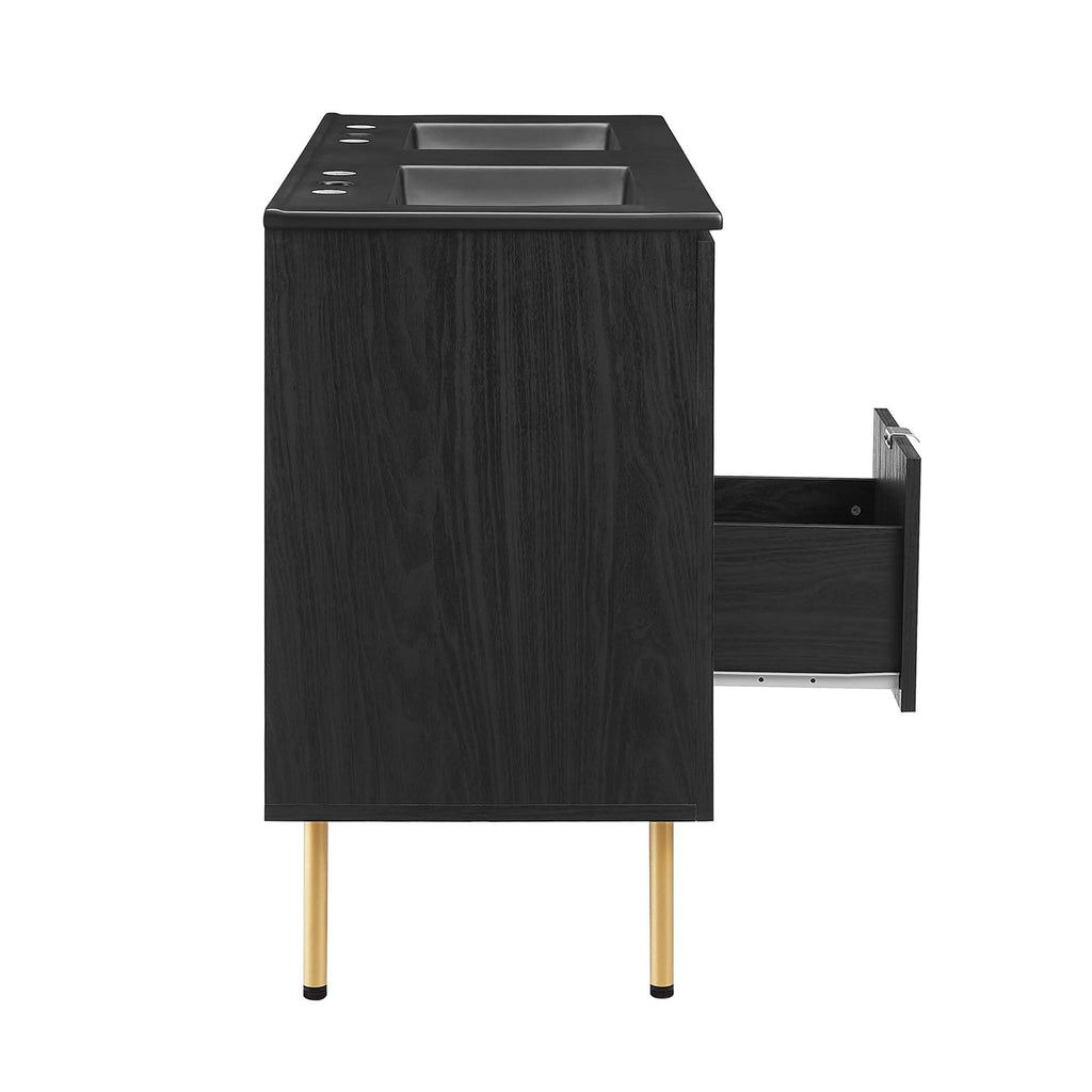 Refresh your washroom with the textured detail of the Chaucer 48" Double Basin Bathroom Vanity. Featuring beautiful rattan weaving on its doors, this vanity cabinet instantly updates any bathroom or powder room. A spacious bottom drawer and a decorative top drawer sit between two hinged doors, each opening to reveal an adjustable top shelf and a fixed bottom shelf, offering ample storage space for toiletries, towels, and other bathroom essentials. With a ceramic double basin with 8" centerset holes and an integrated countertop, this vanity�s design highlights its sleek and spacious countertop for an added touch of elegance. Enriched by stylish round metal cabinet knobs on its cabinet doors and a finger edge pull handle on its drawer, this vanity rests on sleek legs with adjustable feet for added stability. Durably crafted with MDF, particleboard, and wood grain laminate this bathroom vanity washbasin brings natural organic aesthetics to your decor. Assembly required. Fixtures not included. Top Shelf Weight Capacity: 24 lbs. Bottom Shelf Weight Capacity: 46 lbs. Set Includes: One - Cayman 48" Double Basin Bathroom Sink One - Chaucer 48" Bathroom Vanity Cabinet (Sink Basin Not Included)