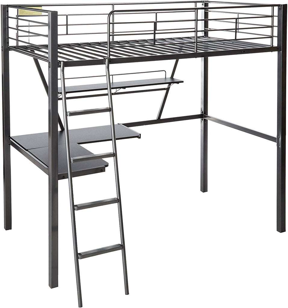 Organize your teens room with this highly functional metal tube loft bed. Perfectly constructed to create a special corner for your youth where he can relax, meditate, create and ideate creatively. The versatile twin loft bed features easy access guard-rails, a slat system, reversible front ladder, a shelf and a desk. To complete the inspiring set, a foldable bed can be bought to create additional space at the bottom of the bed. The large desk board has a dimension of 39 inches by 16 inches by 28 inches while the small one has 23 inches by 16 inches by 28 inches. The twin size top bed comes with a weight capacity of 175Lbs.