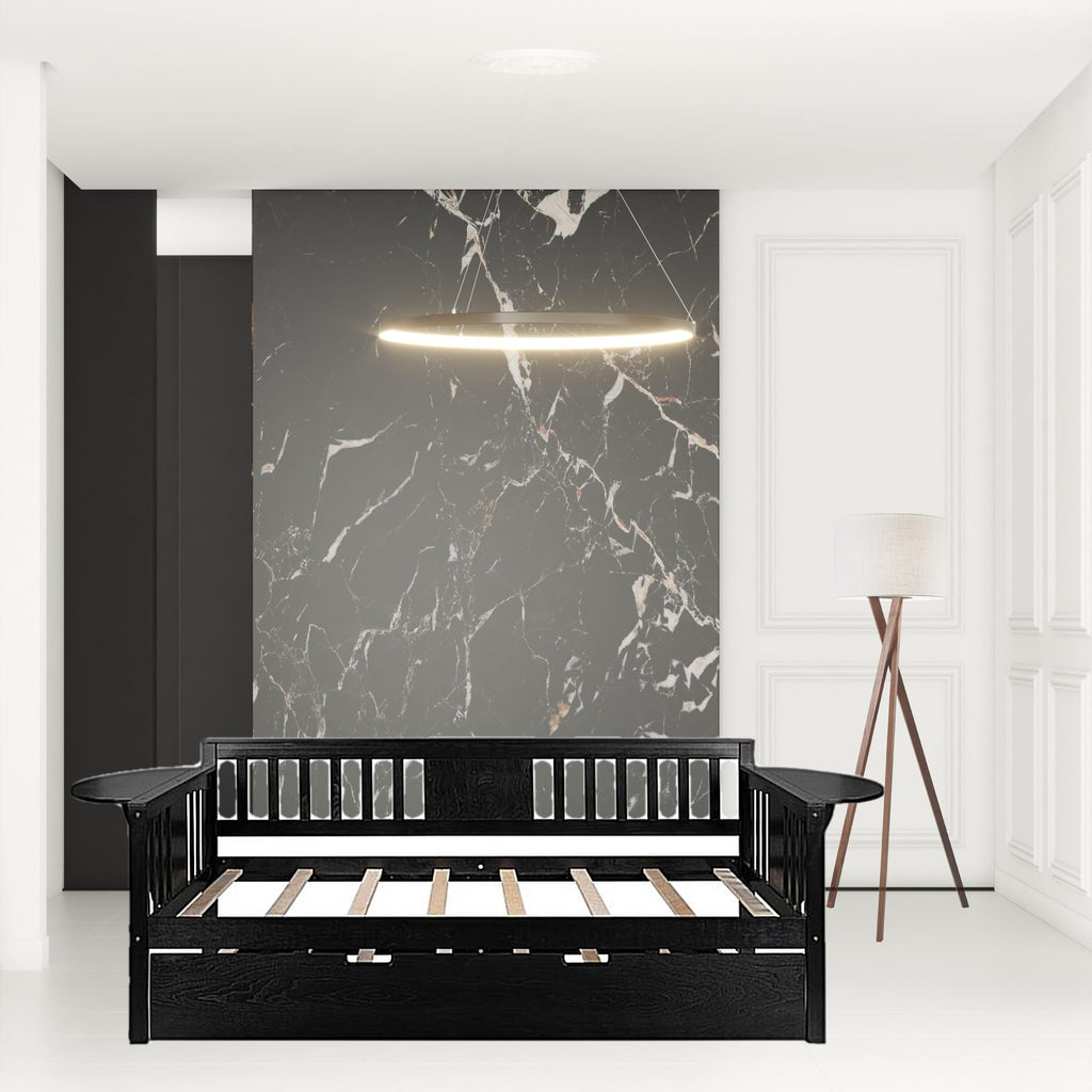 Drift off to a great night's sleep with the luxuriously stylish espresso twin bed with trundle. Add sleeping capacity to your space with this twin rolling platform that stows away under the primary bed and pulls out to create an additional bed. We spend so much time in our bedrooms, thus making quality craftsmanship and good looks vitally important. This bed is the perfect way to make your bedroom comfortable and inviting. 34-inch H x 80-inch W x 41-inch D