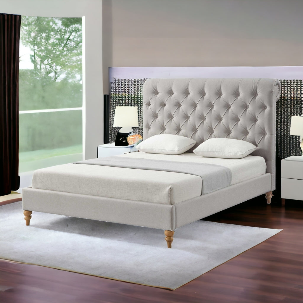 Gray Solid Wood King Tufted Upholstered Linen Bed with Nailhead Trim