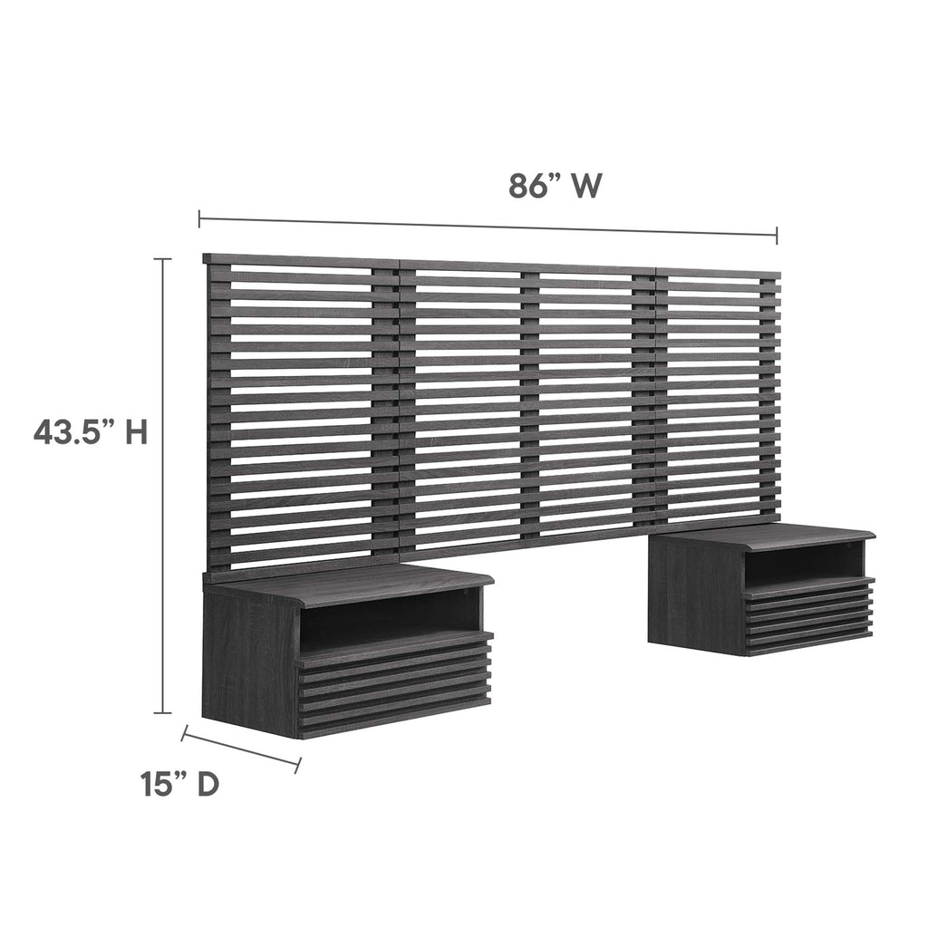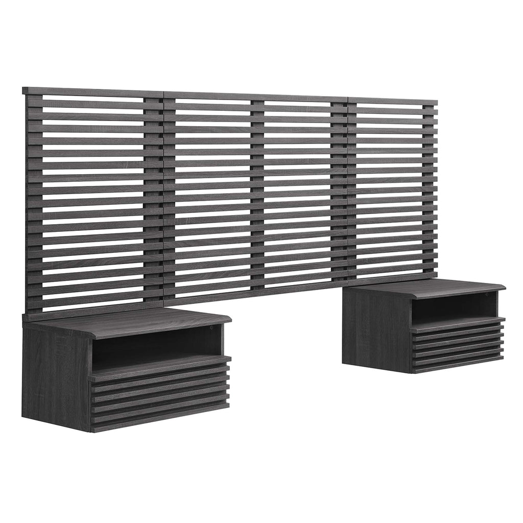 Tap into mid-century aesthetics with the Render Wall-Mount Twin Headboard and Nightstands Set. With slatted detail commanding a presence in a kid's bedroom or guest bedroom, this twin size headboard is a collection of panels that feature durable particleboard frames with smooth wood grain laminate. The full-extension glide drawers and open shelves on the nightstands offer ample storage space to keep bedside essentials neat and organized. Both the headboard and the 1-drawer nightstands mount directly to the wall at your desired height to create an eye-catching backdrop in the bedroom. Set Includes: One - Wall Mounted Headboard Two - Night Stand Two - Wall Mounted Headboard