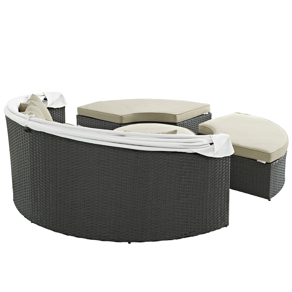 Outfit your patio with an imaginative Sojourn Outdoor Patio Furniture series. The Sojourn Outdoor Sectional Sofa Daybed offers a robust seating experience that easily rearranges according to usage. Outfitted with industry-leading Sunbrella¨ fabric cushions, synthetic rattan weave, UV protection, powder-coated aluminum frame, immensely enjoy your outdoor time with a retractable canopy daybed that enhances patio, backyard, or poolside areas. This installment of the series is an Outdoor Patio Daybed. Set Includes: One - Sojourn Bed One - Sojourn Coffee Table Two - Sojourn Ottoman