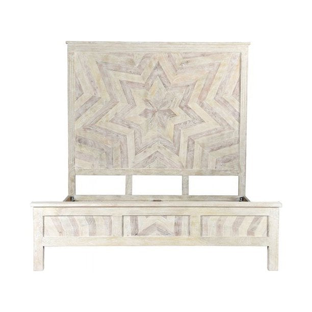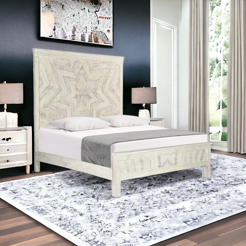 Add a luxuriously appointed bed that will help you create an oasis of comfort and relaxation in your home with this solid wood king white bed. Built to last, this piece not only looks good but reflects high quality craftsmanship from top to bottom. Featuring hand carved design and a distressed wash finish that highlights the beauty of genuine and natural wood. This bed will help to create a peaceful environment that will provide restful slumber for years to come. 82" H x 81.5" W x 90" D