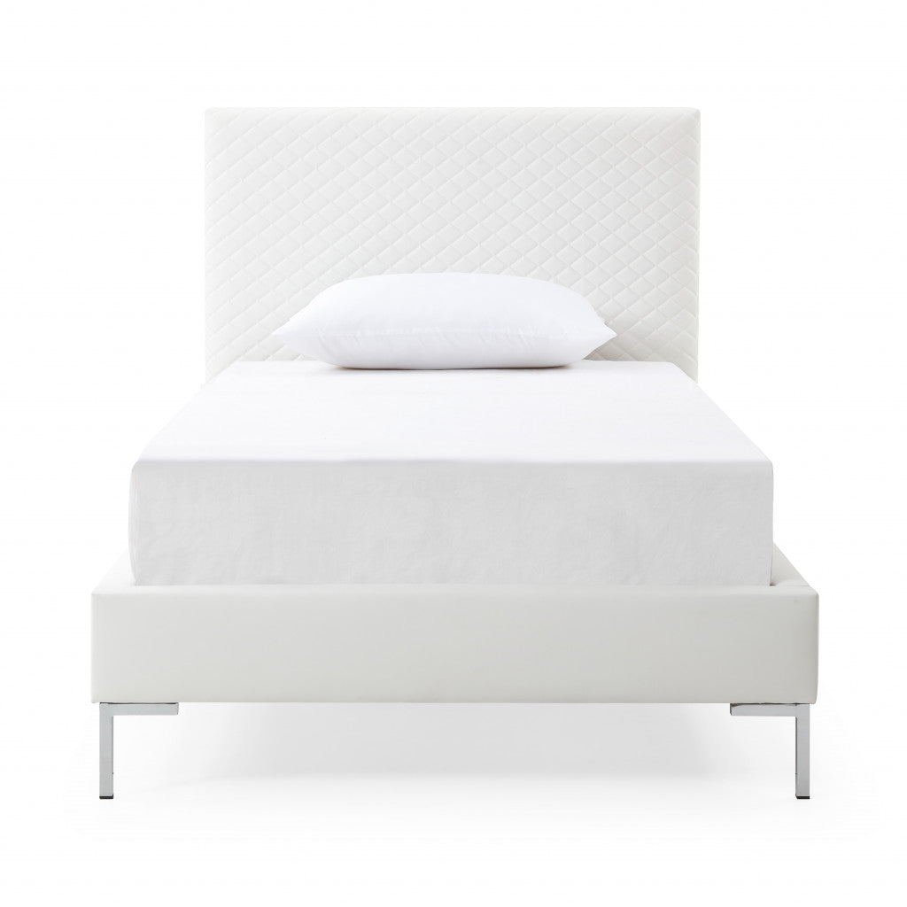 Update and anchor your room in style with the fabulous twin size white upholstered faux leather bed frame. This partially upholstered bed frame is covered in a beautiful and dreamy cloud white faux leather that brings a unique and special touch to your room. Built to last, this piece not only looks good but reflects high quality craftsmanship from top to bottom. This bed is the perfect way to make your bedroom comfortable and inviting.43" H x 42.5" W x 81" D