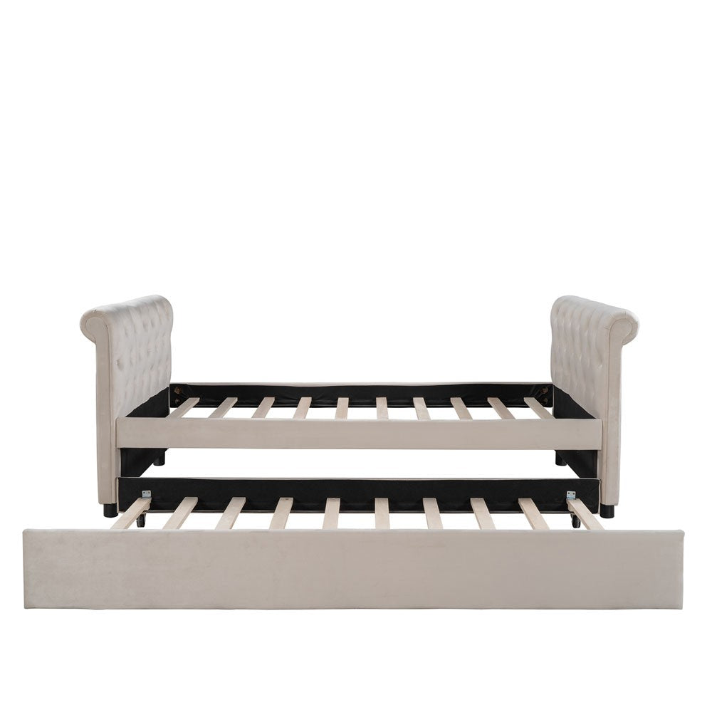 Twin Tufted Beige Upholstered Polyester Blend Bed With Trundle