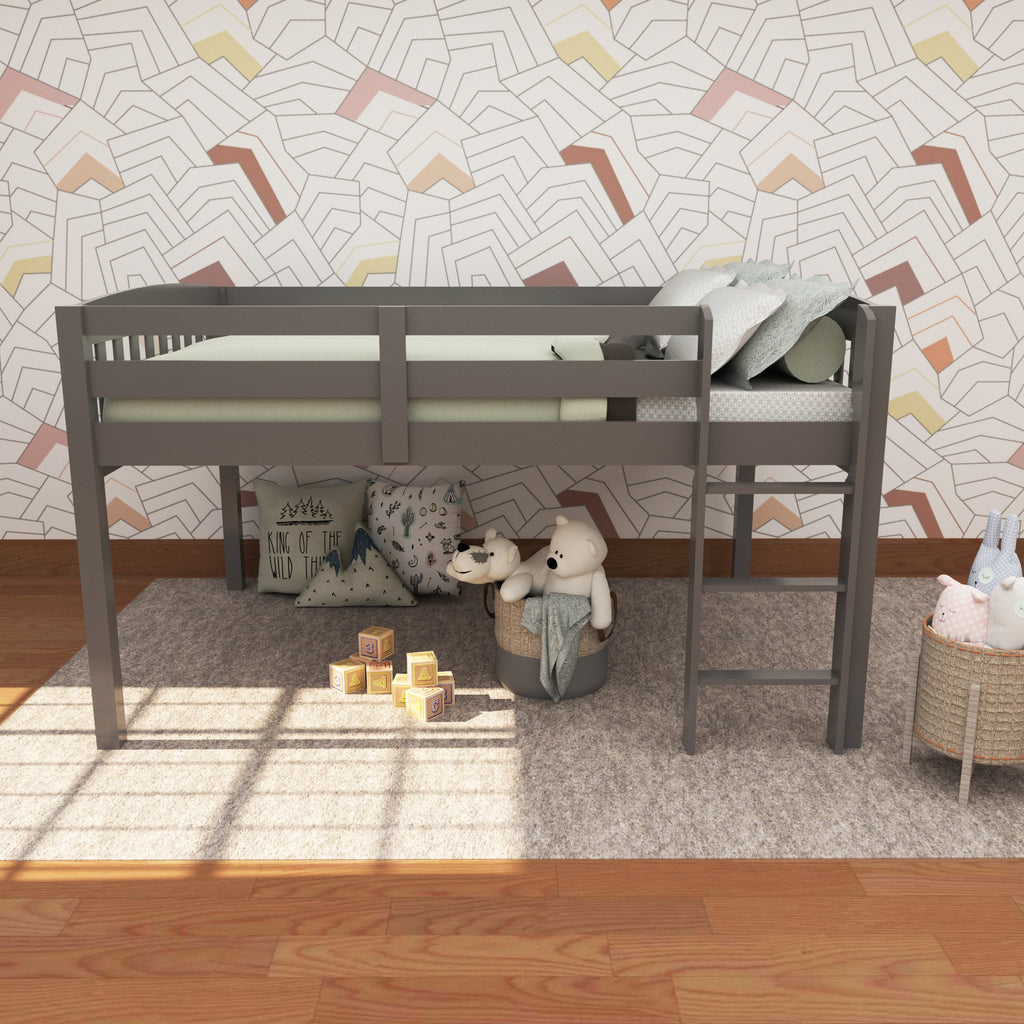 This White Solid Wood Twin Size Loft Bed is sure to bring a stylish, space saving and fun vibe to your child's bedroom. High quality construction of solid pine in a low loft style bed, raises this platform bed above the floor to provide a perfect play area for little ones underneath, or additional storage. The open area allows room for creative play and or additional storage as you can add in a small bookcase, small dresser, or bins to keep everything neat and tidy. This modern design loft bed combines simple and good looking style with practicality and is space friendly. 47" x 59" x 80"