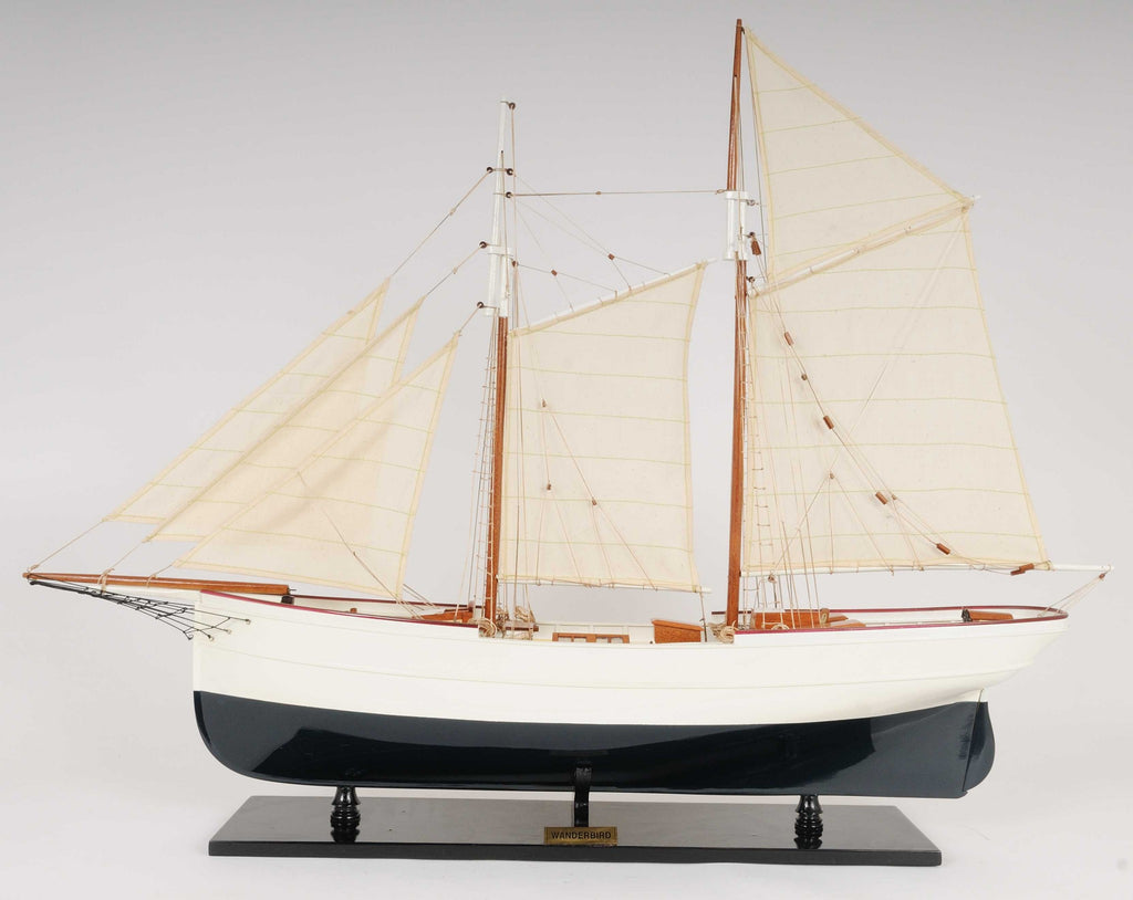 This is Museum-quality, Fully Assembled edition of the Wanderbird. The model is 100% hand built from scratch using plank on frame construction method. Our master craftsmen have spent more than 100 hours to finish it. Made of Mahogany and painted in white and very dark blue(closer to black). This replicas magnificent details include metal steering wheel, skylight, deck houses, advanced intricate rigging, full cloth sails with detail stitching, wood inlay deck and many more. Comes on a solid wood base, with metal nameplate.