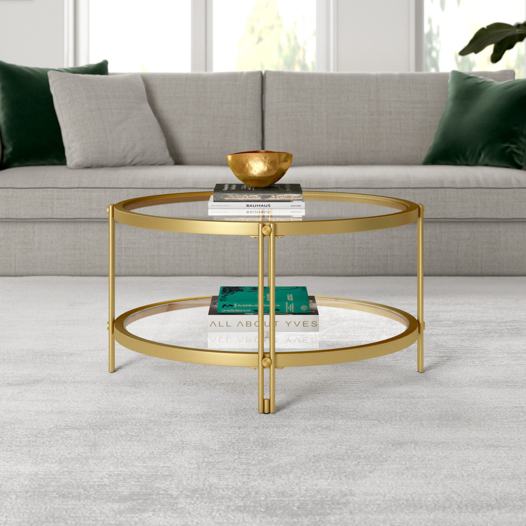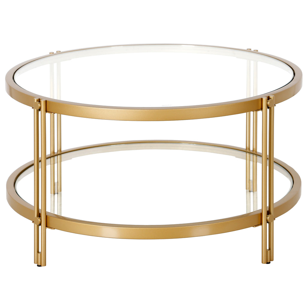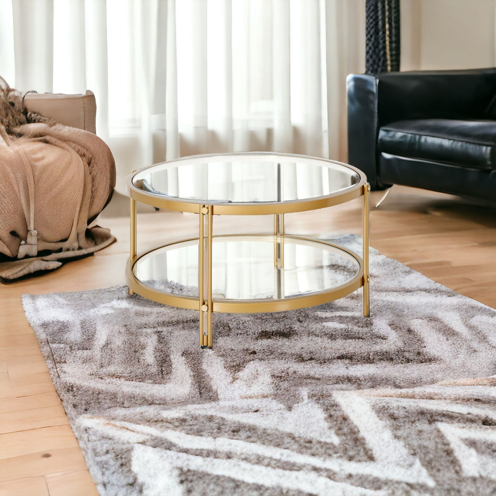 32" Gold Glass And Steel Round Coffee Table With Shelf