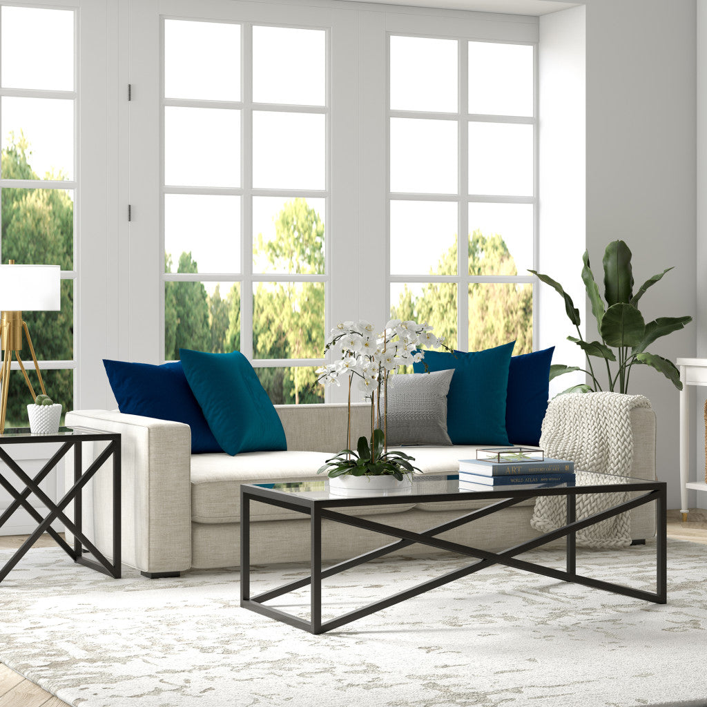 Stylish and super sturdy, the 45-inch black glass and steel coffee table with shelf is an amazingly good looking coffee table that will compliment your living room. A sleek black monotone color gives this steel and glass table a fresh and updated look. Help to keep your space organized with the included single shelf. This rectangular table is an classic yet updated way to accent your room. If you're looking for something that can fit into a living area, bedroom, or office, this coffee table is for you. This coffee table is the sturdy, reliable and stylish answer to your living room needs. 18-inch H x 45-inch W x 20-inch D