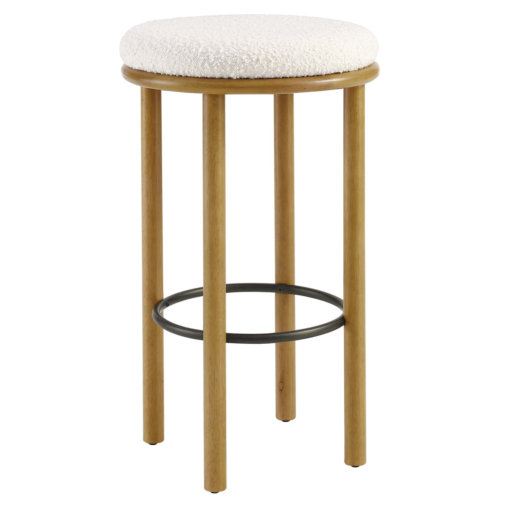 The Fable Bar Stools Set of Two embodies a streamlined design with a dash of modern flair, effortlessly fitting for the stylish, contemporary bar area or any part of the home. These 30 inch backless bar stools showcase a sleek profile that enhances everything from minimalist decors to eclectic spaces. Adorned with a plush, round boucle fabric seat with foam padding for comfort, the Fable padded bar stools provide a sensory experience as you enjoy a cocktail or relax with an evening drink. The solid rubberwood frame and legs of these bar-height stools extend down to form a sturdy foundation, showcasing the beauty of natural wood grains, while the integrated metal footrest invites a relaxed posture, perfect for prolonged seating. Each boucle stool comes with non-marking foot glides, a thoughtful addition that preserves your flooring and enhances stability. Assembly is straightforward, allowing these accent furniture pieces to blend into your entertainment space with ease. Whether used at a bar counter or as island stools, the Fable accent stools are a testament to timeless design, harmonizing purpose with style. Weight Capacity: 500 lbs. Set Includes: Two - Fable Bar Stools - Set of 2