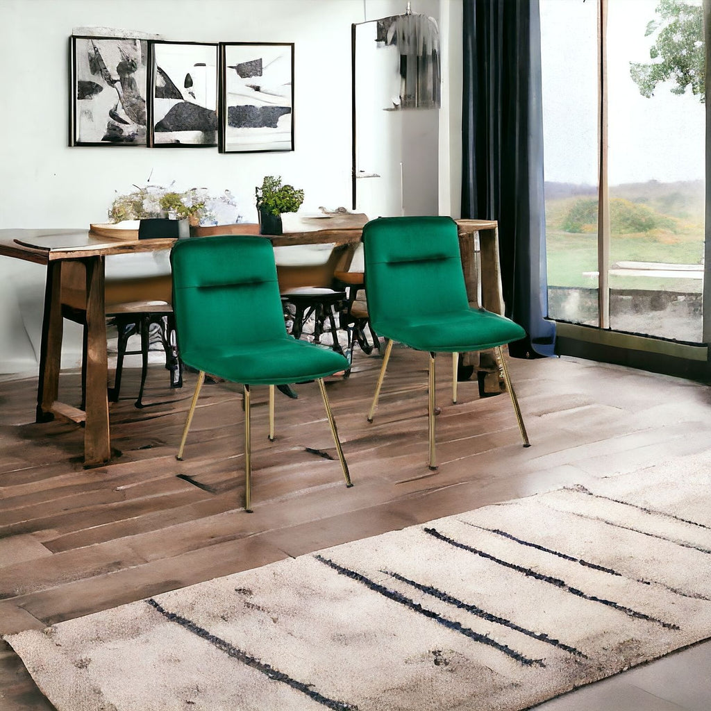Make your dining experience the best with this set of two tufted green and gold upholstered velvet dining side chairs. The addition of a tufted design gives this chair some extra special flair. The side chair has no arms so it can easily fit around the table. Can also be used as an accent in living room or bedroom. The solid back gives this chair its unique style. Dining chairs are a great way to compliment your kitchen or dining room but can also be used in the foyer, hallway, or any room you might need extra seating. 33.27-inch H x 18.9-inch W x 24.61-inch D