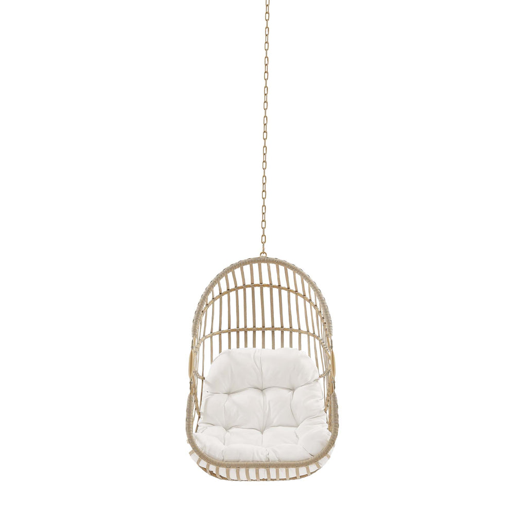 Sway into peaceful relaxation with the Amalie Outdoor Patio Swing Chair. Wrapped in a textured rattan weave, this outdoor chair features a plush removable cushion with an all-weather fabric cover. The sturdy frame is crafted with powder-coated steel, making this patio swing a lasting addition to your porch, patio, backyard, or poolside. This outdoor hanging chair includes a complementary hanging chain allowing it to hang suspended from the ceiling. Amalie's charming coastal design is also popularly used indoors in the lounge area, living room, or bedroom space. Assembly required. Weight Capacity: 330 lbs. Set Includes: One - Swing chair NAT basket frame and White cushion