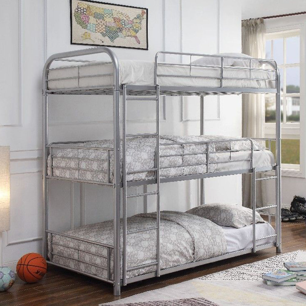 The ultimate space saver for small rooms,this triple metal bunk bed will be the best addition for your sweet home. Stacking three beds securely, the easy access guardrails keep your kids snug and secure, while the two built-in ladders offer easy access. This bunk bed is available in both twin and full size in smooth sandy black, white, gunmetal, and silver finishes.