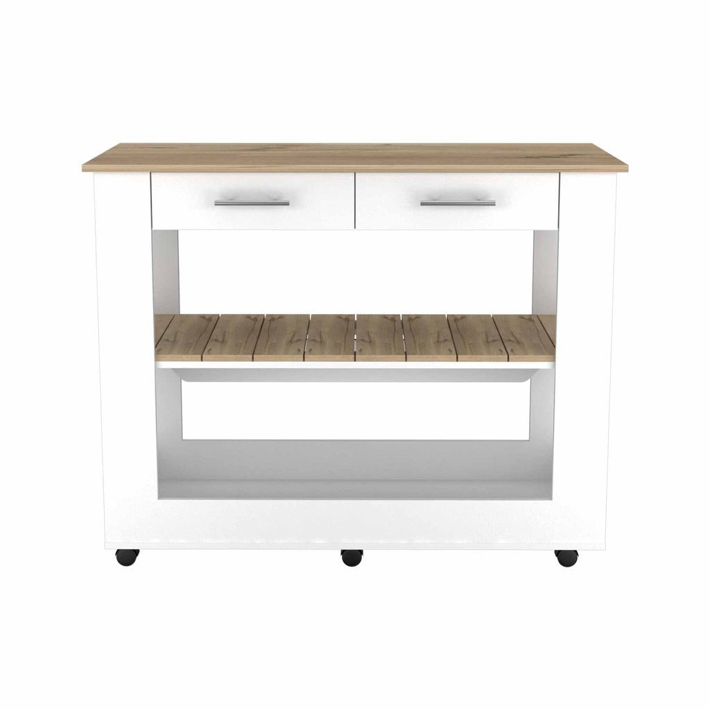 Light Oak and White Kitchen Island with Drawer Shelves and Casters