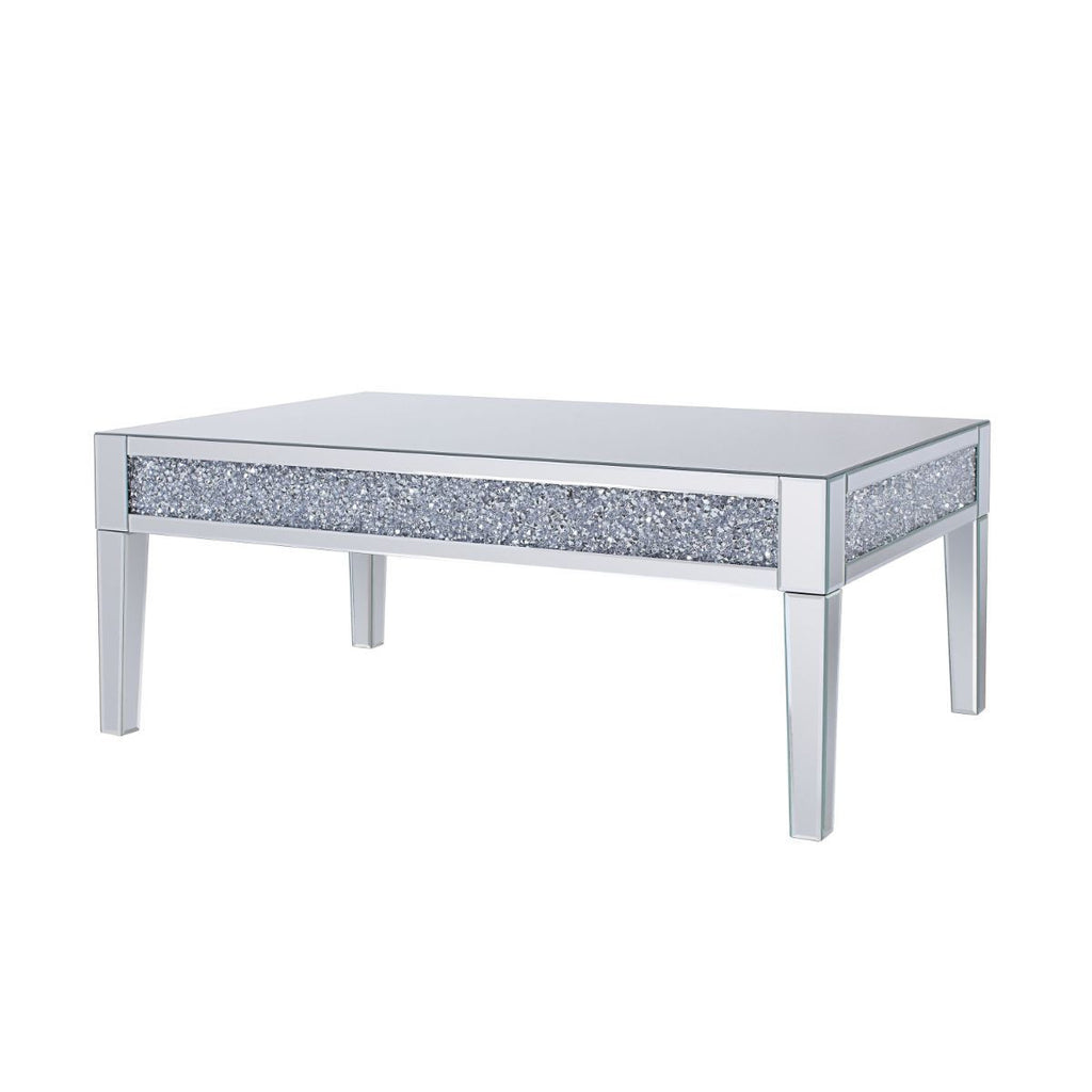 Stylish and super sturdy, the 48" silver mirrored rectangular mirrored coffee table is an amazingly good looking coffee table that will compliment your living room. A sleek silver monotone color gives this manufactured wood and mirrored table a fresh and updated look. Reflective pieces of mirrored glass give this table a glamorous and unique look. This rectangular table is an classic yet updated way to accent your room. If you're looking for something that can fit into a living area, bedroom, or office, this coffee table is for you. This coffee table is the sturdy, reliable and stylish answer to your living room needs. 19" H x 48" W x 29" D