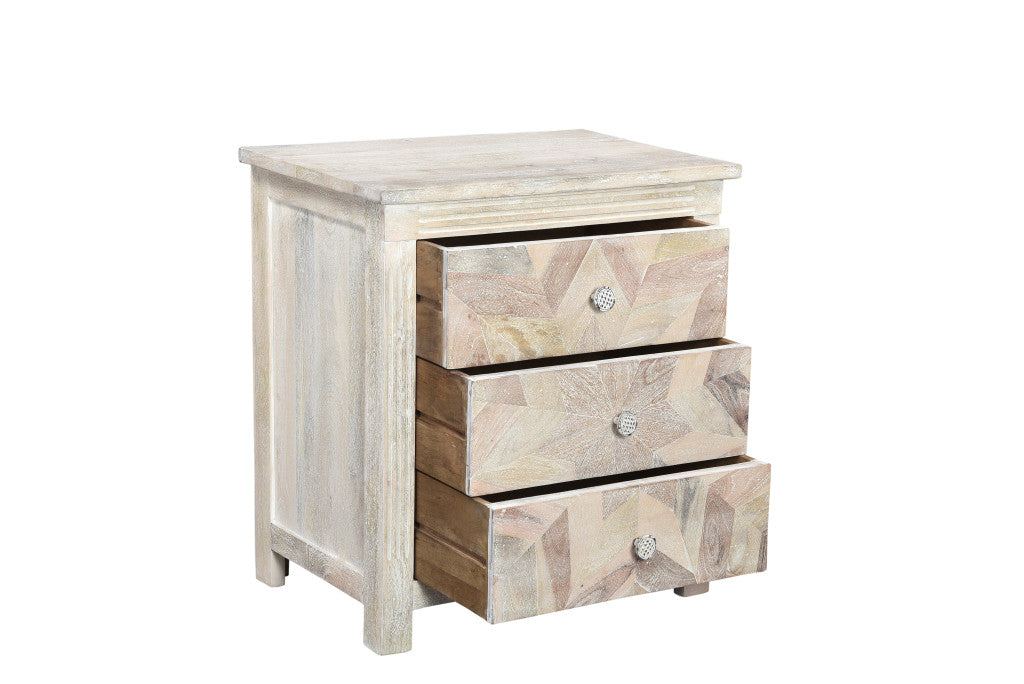30" Distressed White Three Drawer Geometric Pattern Solid Wood Nightstand