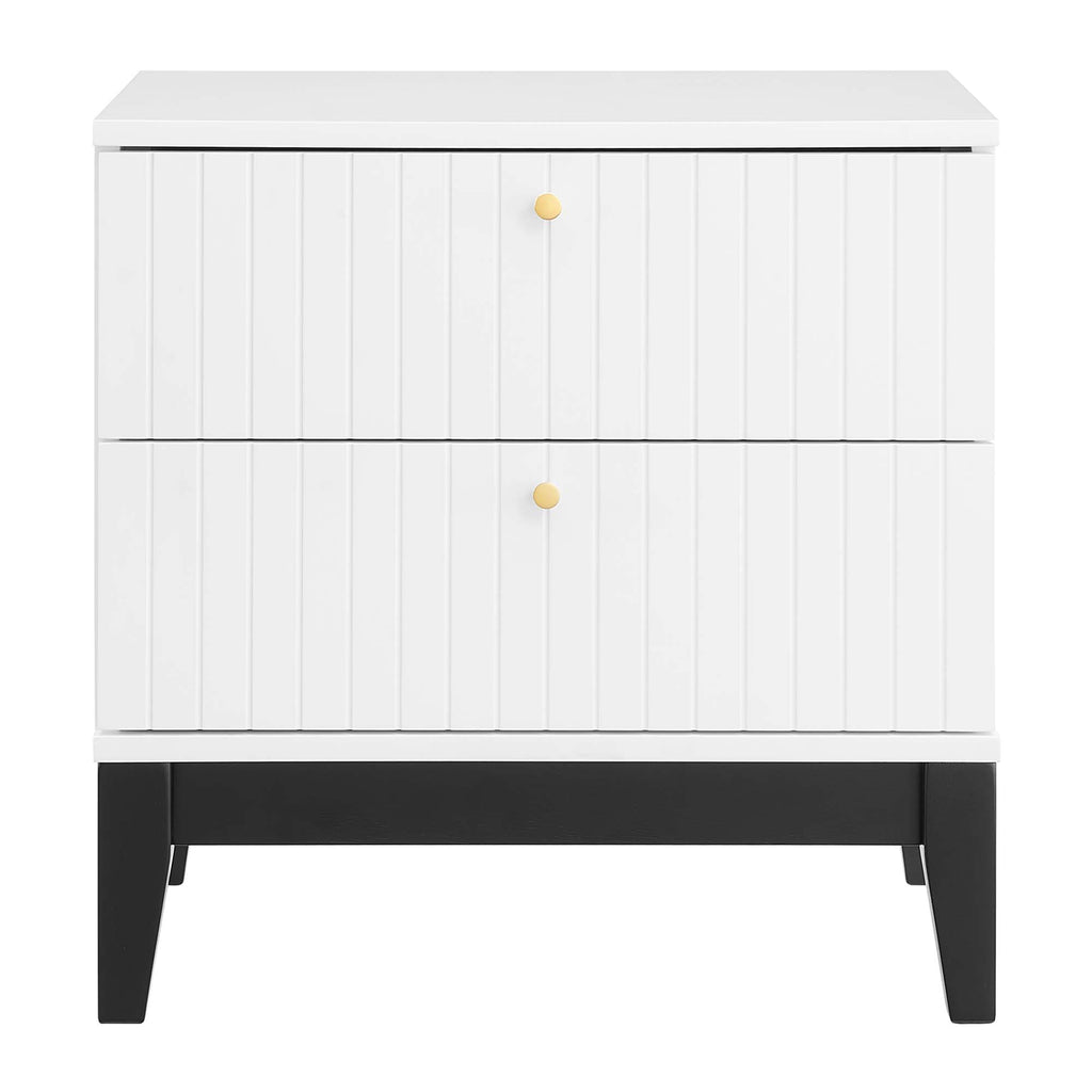 Restyle your bedroom decor with the Dakota Nightstand. Blending contemporary modern design with mid-century style, this nightstands is complete with a clean-lined design with panel detail and brass hardware. Also functional as a versatile end table or accent table, this nightstand features a durable rubberwood and painted MDF construction and rests atop a tapered frame with felt foot pads to protect flooring. Keep visual space clean with the ample storage space in the two full-extension drawers perfect for storing bedside essentials. Set Includes: One - Dakota Nightstand