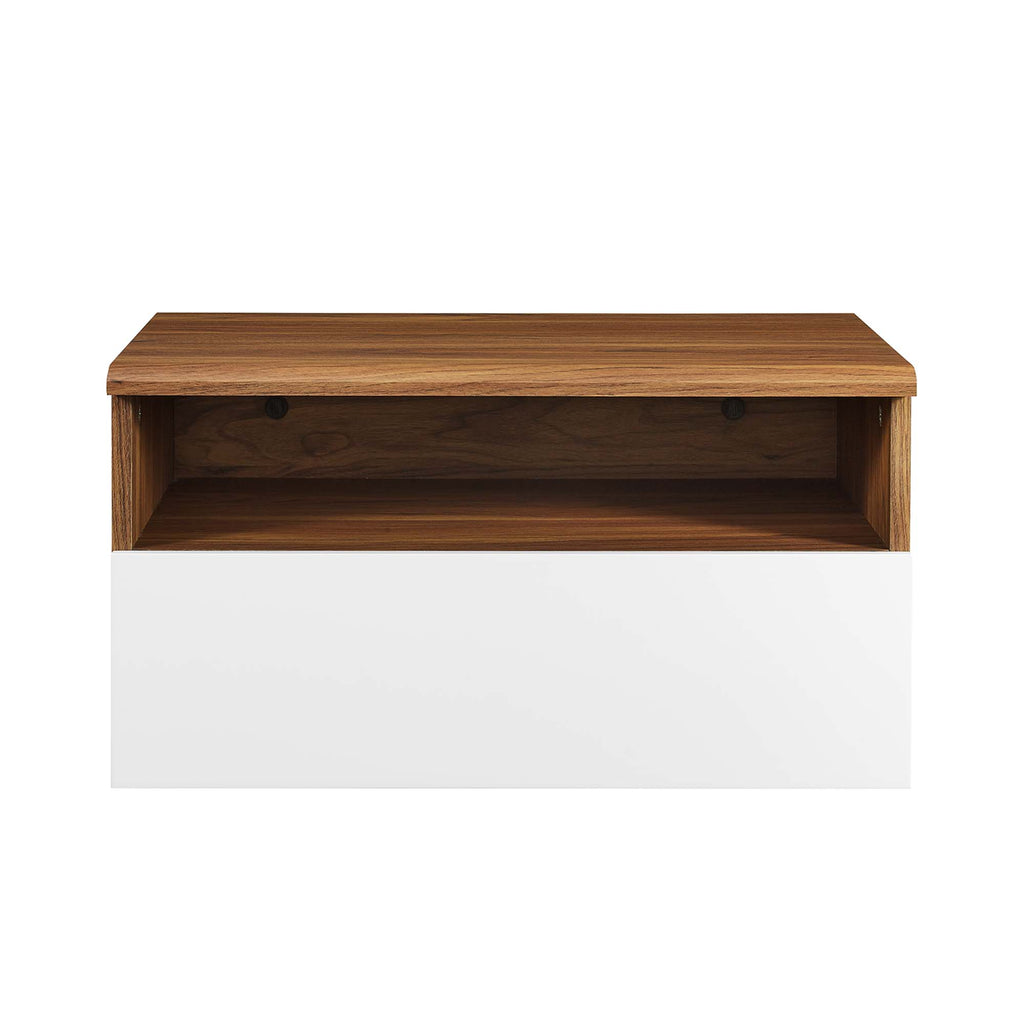 Elevate a bedroom space decor with the Envision Wall-Mount Bedside Table. Featuring an elegant linear silhouette, Envision is crafted with wood grain laminate over durable fiberboard for reliable support. A spacious full-extension drawer under an open shelving area offers ample storage space for bedside essentials. Mounting directly to the wall, this versatile end table updates a primary bedroom or guest bedroom while keeping your visual space clean. Assembly required. Set Includes: One - Nightstand