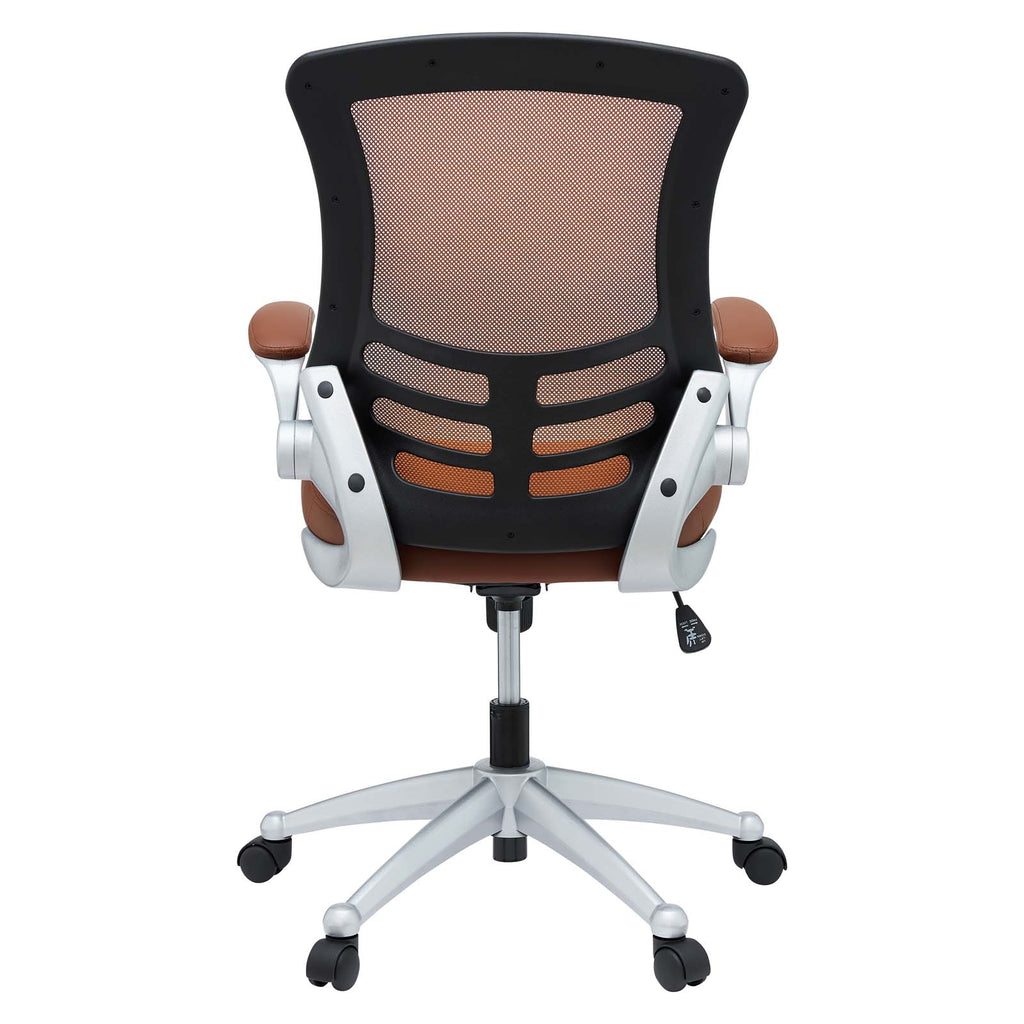 Taking you where you need when you need it most. The Attainment Office Chair is a form-fitting ergonomic chair made from the most revolutionary advances in seating today. The breathable mesh back is curved to assist back and shoulder posture, while the lower frame provides exemplary lumbar support. With flip-up arms and a leatherette padded waterfall seat, enjoy your work from a place of comprehensive comfort. Set Includes: One - Clutch Office Chair with Black Mesh Back and Black Leatherette Seat