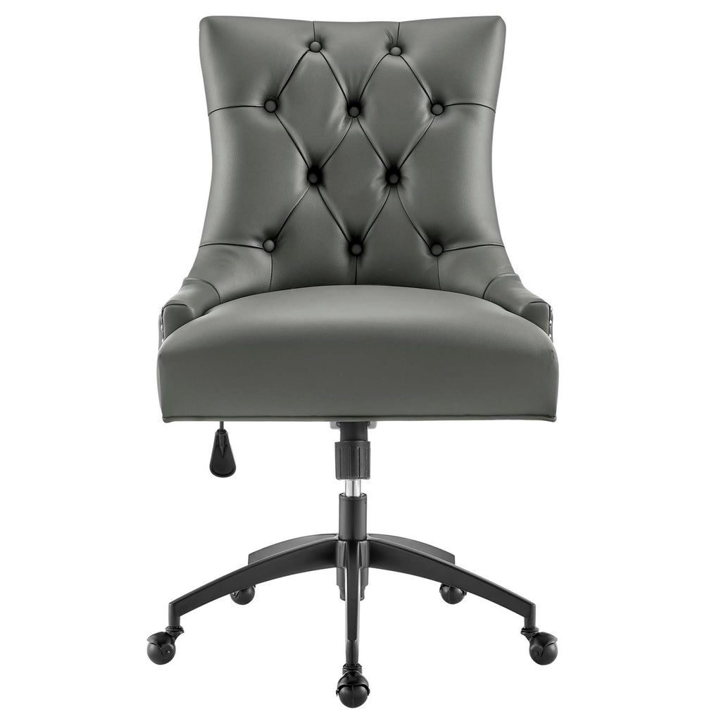 Introduce vintage flair and glam deco appeal with the Regent Tufted Vegan Leather Swivel Office Chair. Metal nailhead trim and tufted buttons provide visual depth, while a luxuriously padded upholstered vegan leather back and seat for exceptional support to this superbly constructed computer desk chair. A matte black metal base and five single ball nylon casters provide easy movement over hardwood or carpeted surfaces while a full 360-degree swivel, tilt tension control, and pneumatic height adjustment create a custom seating experience for optimal performance. Perfect for the modern home or office, this vegan leather office chair is a desirable addition to any workspace. Chair Weight Capacity: 287 lbs. Set Includes: One - Regent Tufted Office Chair