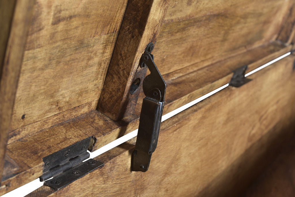 Distinctive in style the 46" honey and black solid wood entryway bench with flip top radiates a versatile charm. The honey solid wood top of this bench is a nice contrast to the high quality, black metal of the base. A convenient flip top gives this bench multi-functionality to house hidden storage to help keep your space neat and tidy. Ideal for entrance foyer, hallway, or laundry room this bench is a great place store your keys, put on your shoes, or be a catchall on your way in or out Benches don't have to be unsightly. Increase your seating, potential storage or display space, and the fashion quotient of your room all at the same time with this hard wearing, versatile, and good looking bench. 17" H x 46" W x 15" D