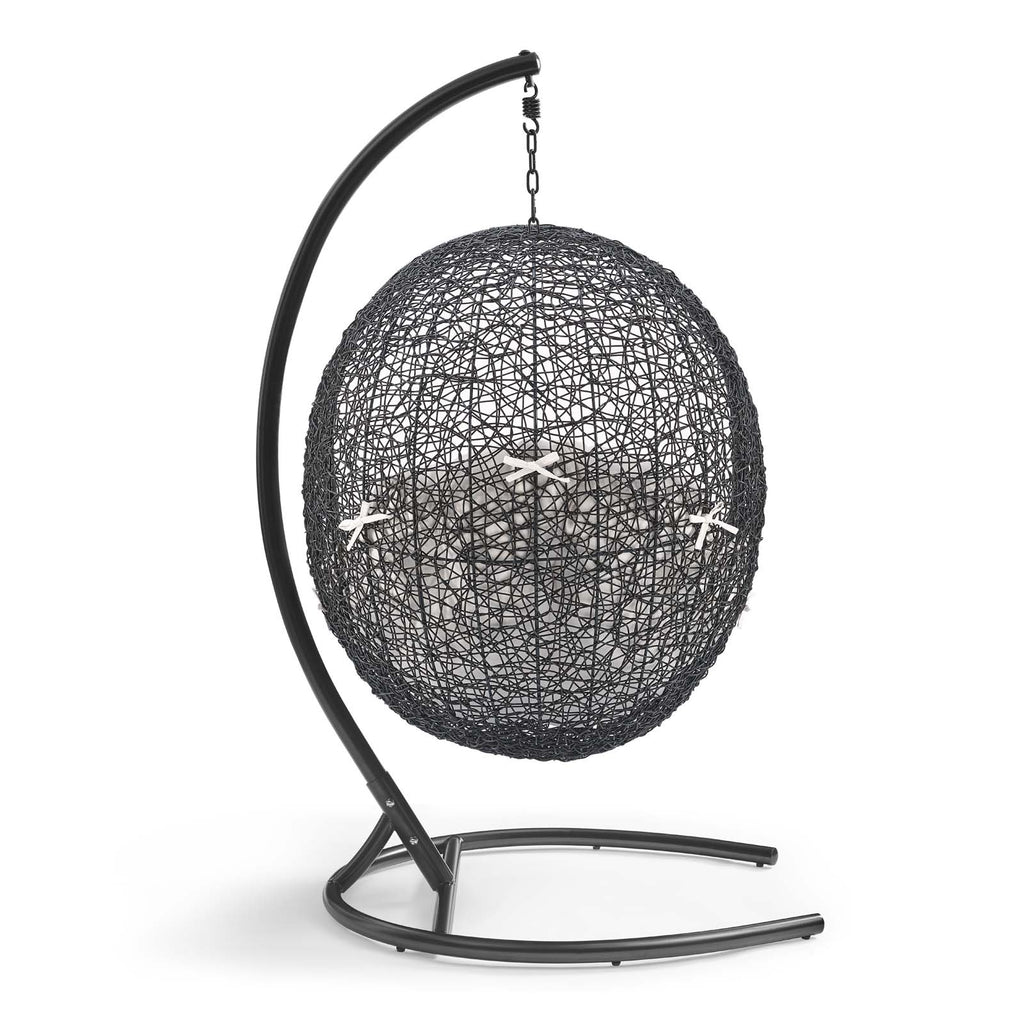 Embark on moments of metamorphosis and rebirth with an exotic hanging outdoor swing chair. Transform the mundane to heightened states of consciousness with Encase Outdoor Swing Chair. This hanging swing chair is comprised of a sturdy espresso metal stand and rattan seat. Surround yourself with plush Sunbrella� fabric cushions to complete entry into a relaxed state in the Encase Hanging Chair. Set Includes: One - Encase Sunbrella� Swing Lounge Chair