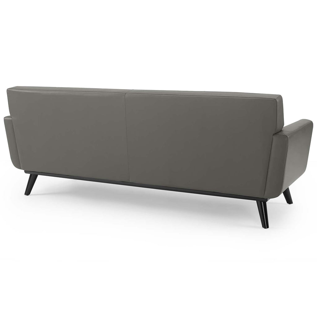 Gently sloping curves and plush removable seat cushions create a favorite living room couch. Whether lounging in solitude or entering a spirited discussion with friends, the Engage mid-century modern tufted top-grain leather upholstered living room lounge 90" sofa is a welcome presence in your home. Seven buttons create eye-catching appeal, adding depth to a sleek retro modern living room sofa that brings your sitting d�cor to center stage. Four splayed wood legs and frame supply a solid base to the comfortable quality leather couch for your living room, lounge room, office or other seating area. Sofa Weight Capacity: 552 lbs. Set Includes: One - Engage Living Room Lounge Sofa