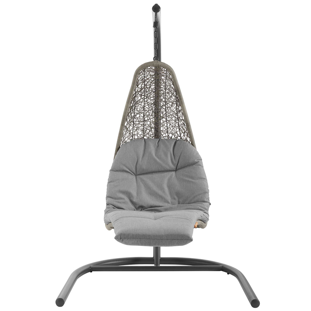 Escape to a place of relaxation with the Landscape Outdoor Patio Hanging Chaise Lounge Swing Chair. Wrapped with a textured synthetic rattan light gray and tan weave, this outdoor chaise lounger features a plush padded cushion upholstered in all-weather polyester fabric for lasting comfort. Hanging from a powder-coated steel frame, Landscape's organic design and sleek profile bring contemporary style to your outdoor patio, backyard, porch, or poolside. Sit back and relax with your feet up while enjoying warm weather and the calming movement of this outdoor porch swing. Includes stand and chain. Hanging Weight Capacity: 264 lbs. Set Includes: One - Landscape Hanging Chaise Lounge Swing Chair