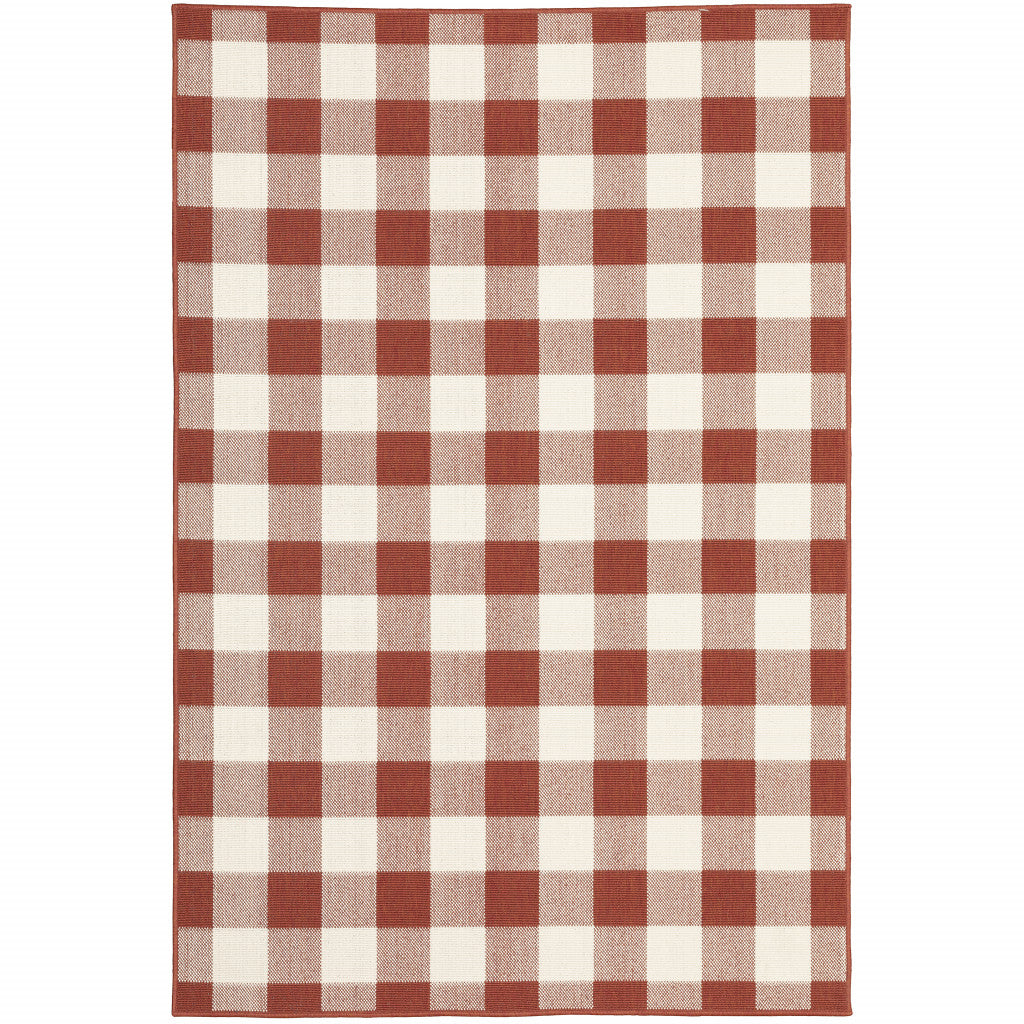 Set an inviting tone in your space with this 4-foot x 6-foot red and ivory geometric stain resistant indoor outdoor area rug. This rectangle shaped rug features a geometric design in red and ivory to give it visual interest. A classic shape marries with good looking design for your space Ideal for spaces with kids and pets, this rug is stain resistant to help repel stains and spilled liquids. Place this area rug against a hardwood or tile floor and it will enliven your living space with style and sophistication. 0.15-inch H x 43.31-inch W x 66.93-inch D