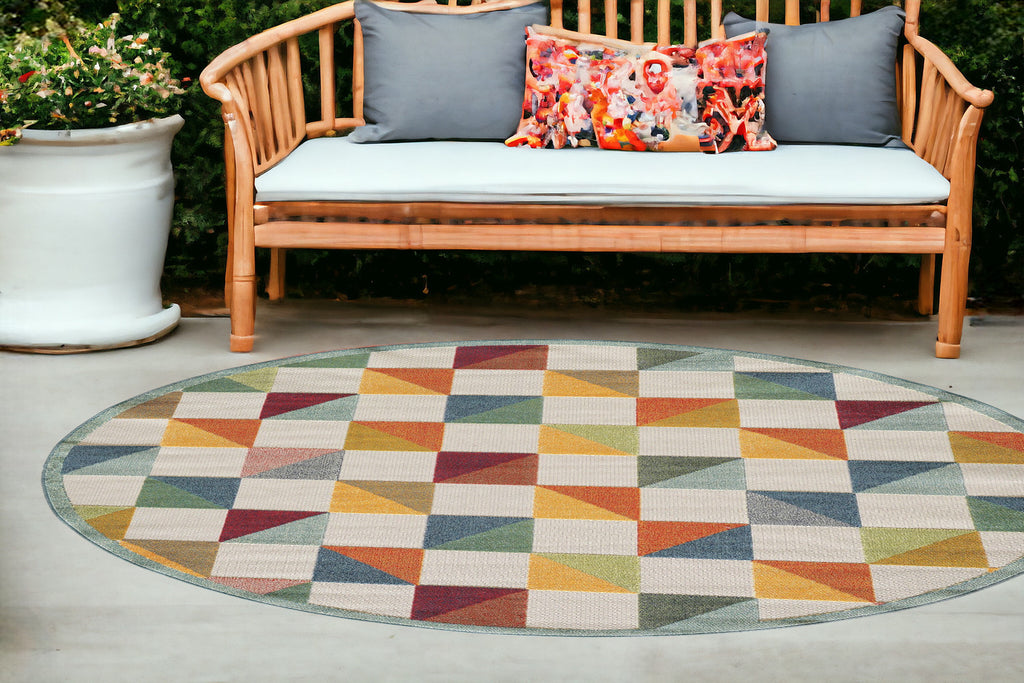 8' Round Orange And Ivory Round Geometric Stain Resistant Indoor Outdoor Area Rug