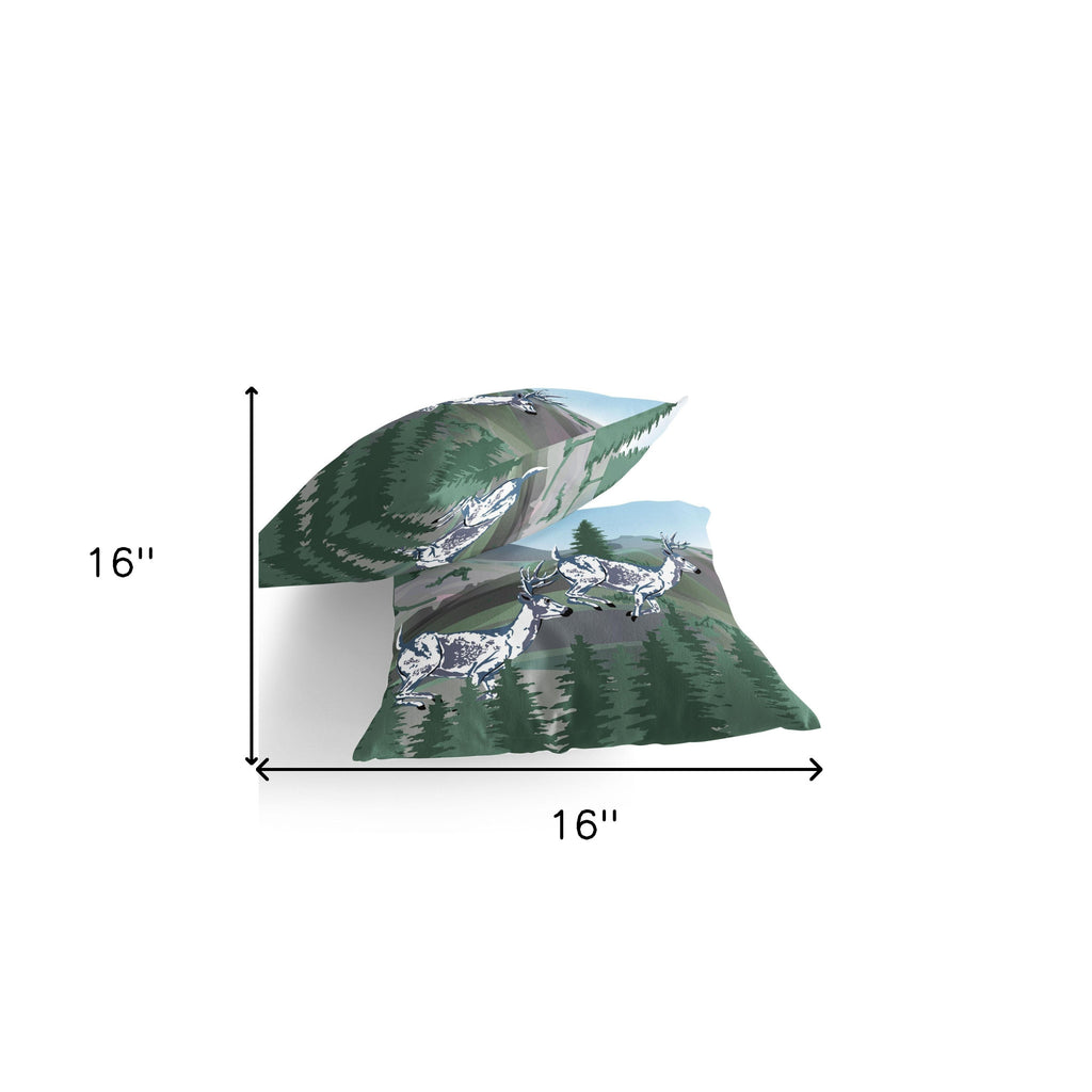 Set of Two 16" X 16" Blue and Green Reindeer Indoor Outdoor Throw Pillow