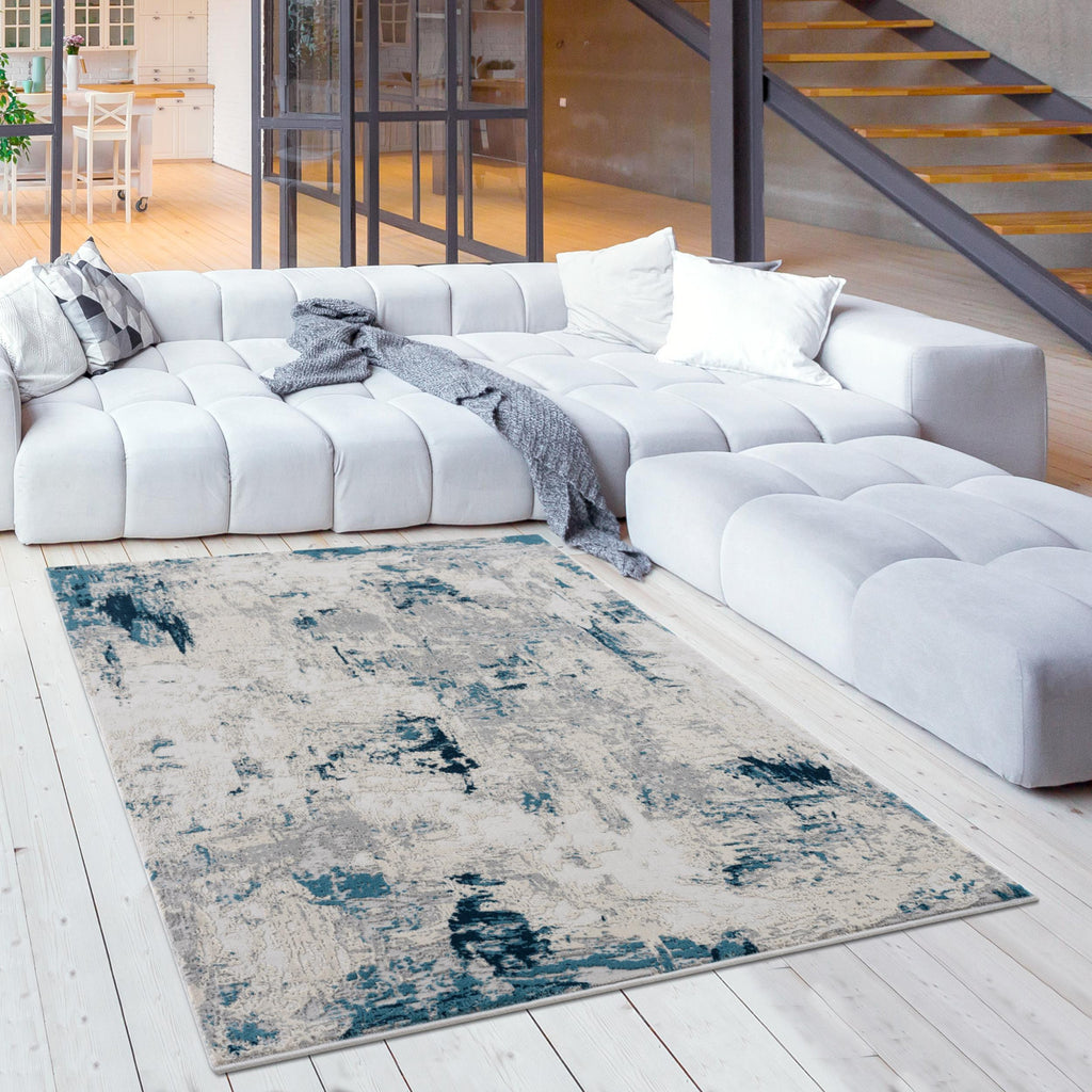 Soothing to the eyes with its oceanic color palette, this Blue and Ivory Abstract Strokes Area Rug will induce a sense of tranquility into your living space. The art of abstraction in the beautiful shades of ivory, gray, and teal looks relaxing with an inviting feel. Upholding the finest craftsmanship of Turkish artisans, this rug is made of 100% premium polypropylene fibers to retain its pristine look for ages while ensuring easy cleaning and stain resistance. Experience the soft and sumptuous feel under the feet due to its high-low pile construction which gives the rug a surface texture. The cool-toned hues of this area rug will induce a refreshing ambiance into your home and uplift the aesthetics of your modern interior. 114” x 78”x 0.8”