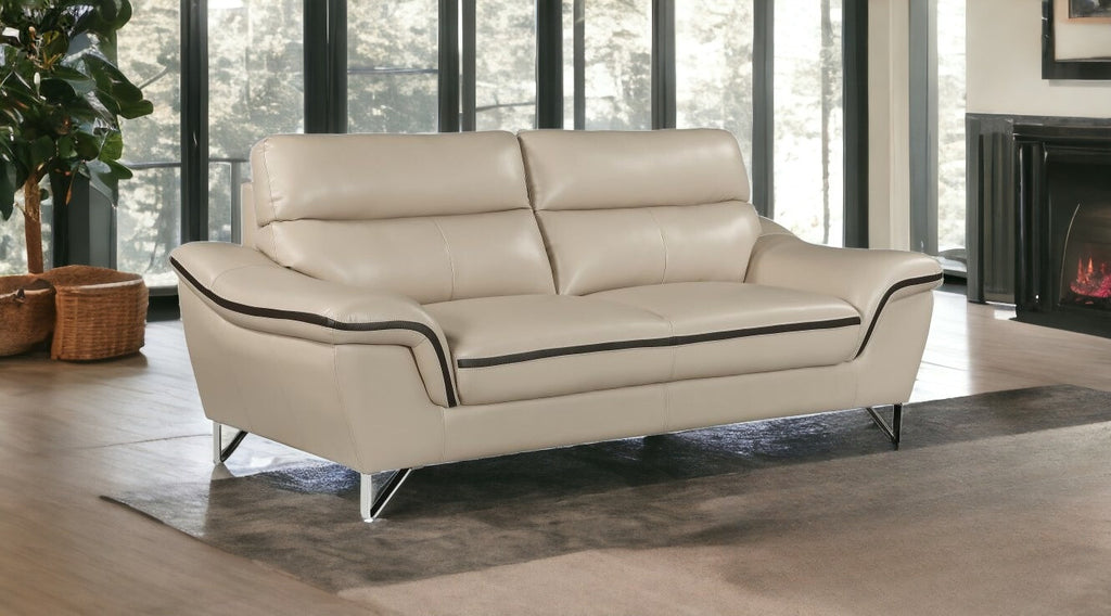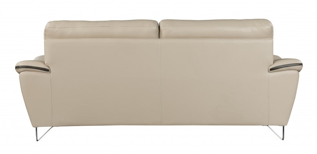 Made of the highest quality, supple leather, this 86-inch beige and silver leather sofa will be the star of your space. The high grade premium leather used makes your lounging luxuriously comfortable and adds an elegant appeal to your space. Solid colors give you lots of decorative options and are easy to work into your decor scheme. Sinuous springs construction gives this piece strong support and makes it comfortable to sit even for long periods of time. Pillow top arms offer a comfy place to rest. Silver stainless steel legs effortlessly elevate the room and add a touch of contemporary design. Built to last, this sofa will be a great centerpiece for your room. 36-inch H x 86-inch W x 37-inch D