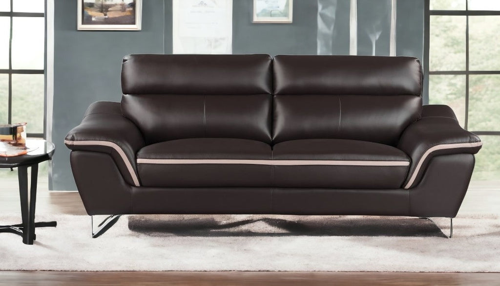 Made of the highest quality, supple leather, this 86-inch brown and silver leather sofa will be the star of your space. The high grade premium leather used makes your lounging luxuriously comfortable and adds an elegant appeal to your space. Solid colors give you lots of decorative options and are easy to work into your decor scheme. Sinuous springs construction gives this piece strong support and makes it comfortable to sit even for long periods of time. Pillow top arms offer a comfy place to rest. Silver stainless steel legs effortlessly elevate the room and add a touch of contemporary design. Built to last, this sofa will be a great centerpiece for your room. 36-inch H x 86-inch W x 37-inch D