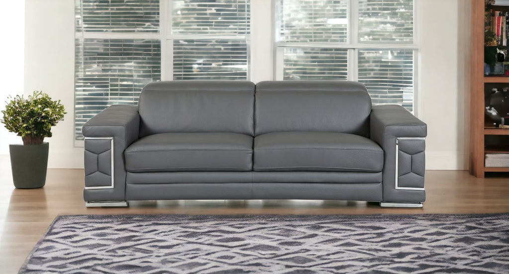 Superior construction from fabulously soft and high grade leather gives this 89-inch gray and silver italian leather sofa a leg up on the competition. The premium leather used makes your lounging luxuriously comfortable and adds an elegant appeal to your space. Solid colors give you lots of decorative options and are easy to work into your decor scheme. Square arms offer a comfy place to rest. Silver stainless steel legs effortlessly elevate the room and add a touch of contemporary design. Built to last, this sofa will be a great centerpiece for your room. 29-inch H x 89-inch W x 41-inch D