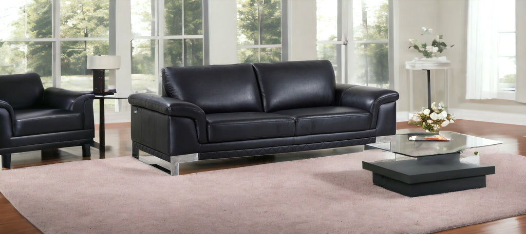An interior designer's dream, this buttery soft high grade leather 90-inch black and silver italian leather sofa will bring just the right touch to your space. The premium leather used makes your lounging luxuriously comfortable and adds an elegant appeal to your space. Solid colors give you lots of decorative options and are easy to work into your decor scheme. Sinuous springs construction gives this piece strong support and makes it comfortable to sit even for long periods of time. Pillow top arms offer a comfy place to rest. Silver stainless steel legs effortlessly elevate the room and add a touch of contemporary design. Built to last, this sofa will be a great centerpiece for your room. 32-inch H x 90-inch W x 39-inch D