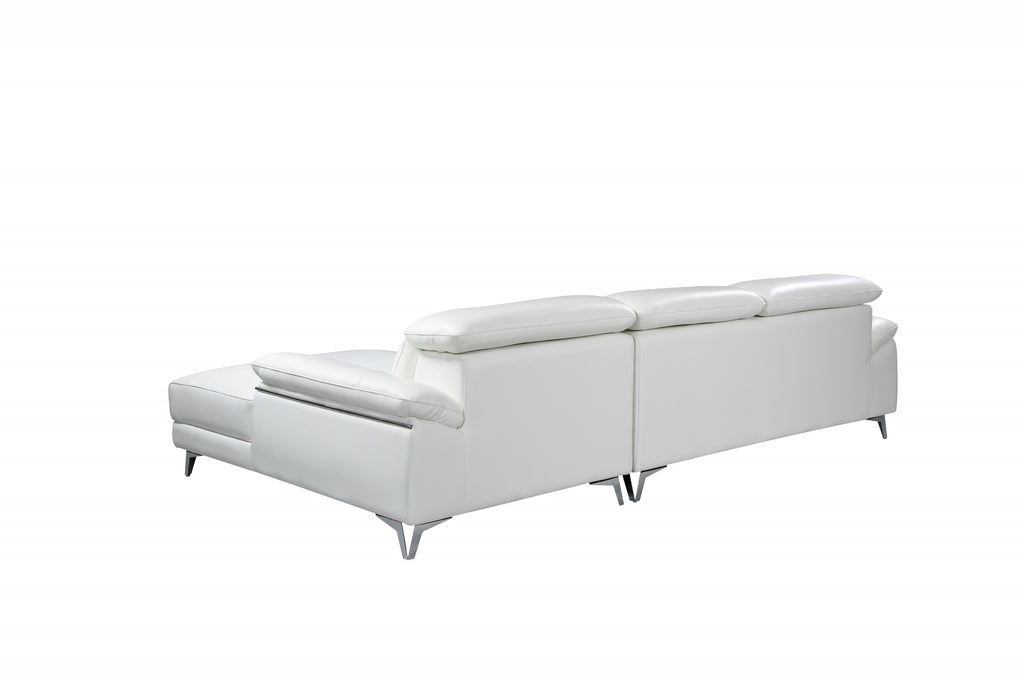 Superior construction from fabulously soft and high-grade leather gives this white italian leather l shaped two piece sofa and chaise sectional a leg up on the competition. The premium leather used makes your lounging luxuriously comfortable and adds an elegant appeal to your space. Solid colors give you lots of decorative options and are easy to work into your decor scheme. Silver metal legs effortlessly elevate the room and add a touch of contemporary design. A great showpiece for your room, this sectional is a must have. 39-inch H x 181-inch W x 41-inch D