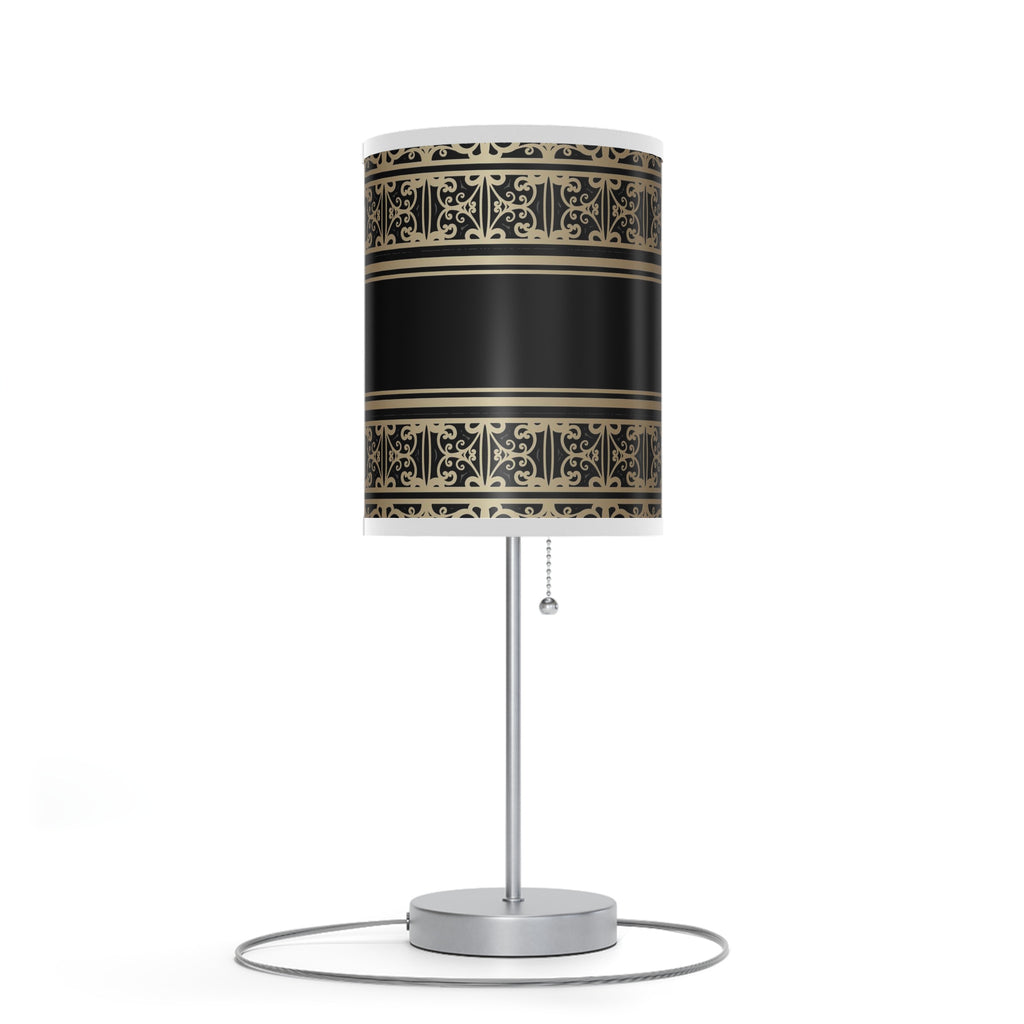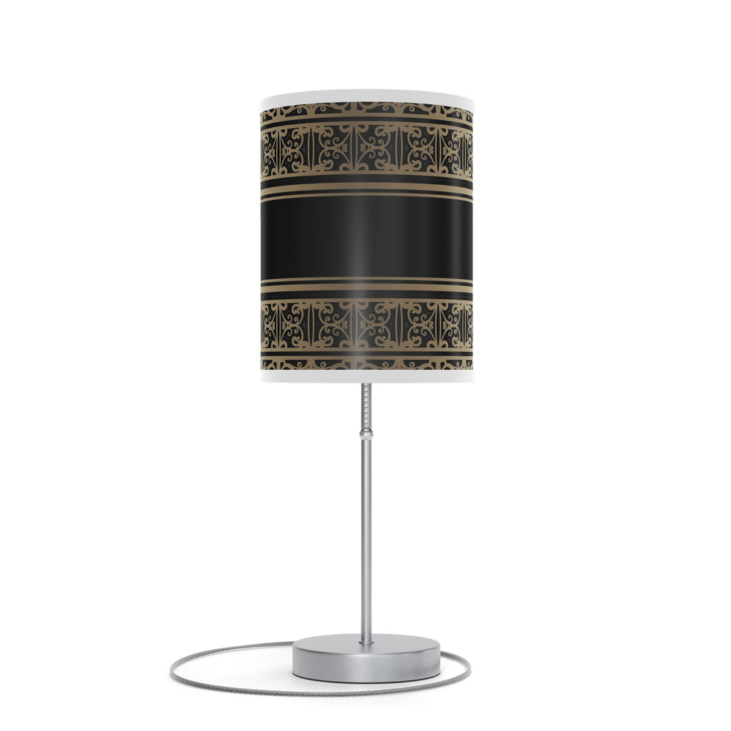 With this 20" silver metal standard table lamp with black and gold cylinder shade you can bring in design to any space along with adding some ambient lighting. A gorgeous silver metal base brings just the right amount of pizzazz to this fabulous lamp. The black and gold cylinder fabric printed pattern designed shade is finishes this piece off nicely and symmetrically with regal style. This standard table lamp is designed to provide general lighting to the area. High quality design makes this a great lamp for not only lighting, but accenting a room with style. The perfect lamp to create just the right natural and soothing light in your space. 20" H x 7" W x 9" D